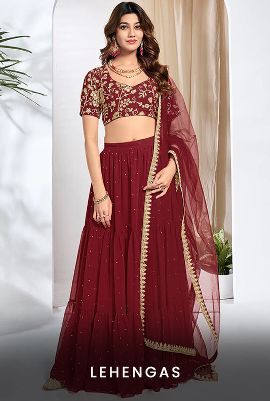Lehengas or Lehenga choli have a special significance in Indian Ethnic Wear. You have to have a Lehenga in your wardrobe to make it complete. It is the most elegant piece of Indian Clothing which consists of a stylish skirt, a blouse, and a dupatta/choli. Lehengas are what every Indian girl dreams of wearing on her big day. Its style and suave is impeccable and is an essential partywear product. Lehenga cholis are traditionally heavily decorated with zari, beads, thread-works, or other motifs, making them perfect to wear on special occasions such as wedding ceremonies and festivals. However, to match the fashion needs of the modern woman, designers at Inddus came up with various types of Indo-western party-wear Lehenga cholis that have simpler designs on them and can be worn to casual parties and gatherings. We use stylish fabrics such as Net, Georgette, Cotton Blend, Silk, etc for our products. Lehengas Cholis is a hot product for the Navratri festival worldwide. Bridal Lehengas is a must for women who want to stand out during the wedding season. Complete your shopping for Indian Dresses online with our wide and exclusive range of designer Lehengas at Inddus.