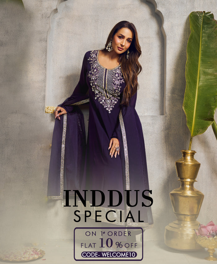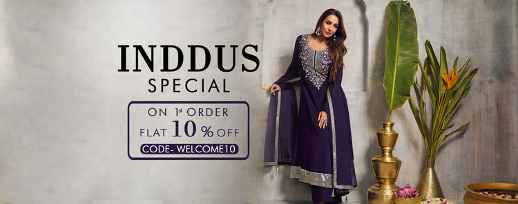 Inddus is an Indian cloth store, an exclusive luxury destination to the most curated collection of Indian ethnic wear. We source traditional fabrics from all across India. Shoppers at Inddus just love our Silk, Handloom Cotton, and organic fabrics which we handpick exclusively before using in our products. We have something for everything. Even when you are far away from India, make all your festivities - from Holi to Diwali to Eid to Navaratri; cultural events, special occasions, and scrumptious weddings special with Inddus' designer ethnic wears. We give FREE SHIPPING WORLDWIDE. Now shop Indian dresses online from the UK, USA, Canada, Mauritius and other countries with us and get quick safe deliveries. Now shop Salwar Suits and Sarees online USA with us for an amazing shopping experience.