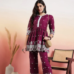 Elevate your ethnic style with our Pink Kurti featuring a beautifully crafted yoke design and thread work details. Made from a luxurious silk blend fabric, this A-line Kurti has an empire style and flared hem for a flattering fit. Paired with solid Dhoti Pants...- $37.05