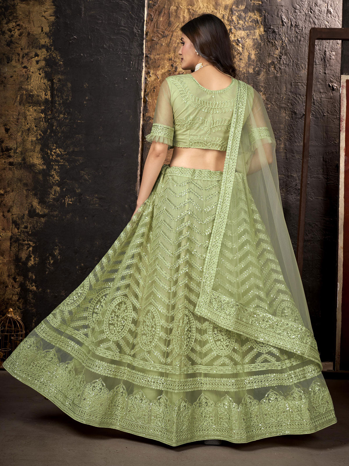 This green embroidered semi-stitched lehenga features a flared hem for an elegant silhouette, paired with a matching unstitched blouse showcasing a round neck and short sleeves. Complemented by a green embellished dupatta with a delicate taping border, this set balances intricate detailing and versatile styling for custom tailoring to your perfect fit. Ideal for festive occasions, it offers both traditional charm and contemporary craftsmanship.