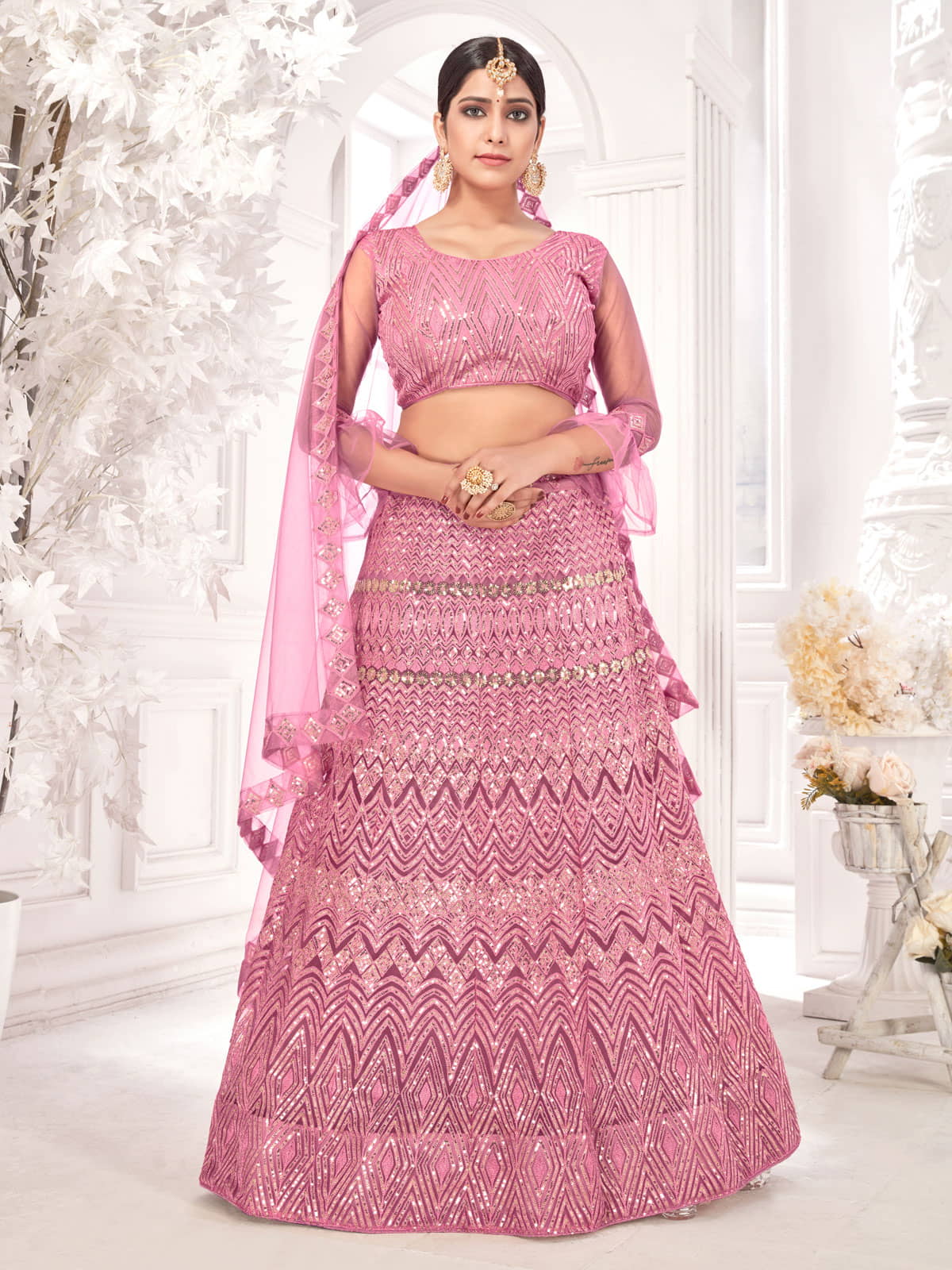 As a product expert, I can confidently assert that the Pink Embroiderd Net Lehenga is a beautiful attire that combines intricate details with customizable fit. Made with high quality materials, this lehenga features Resham, Zari, Sequins, and Patch Border Work for a stunning look. Available with a matching choli and dupatta, this lehenga is perfect for formal occasions. Accessories shown are for presentation purposes only.