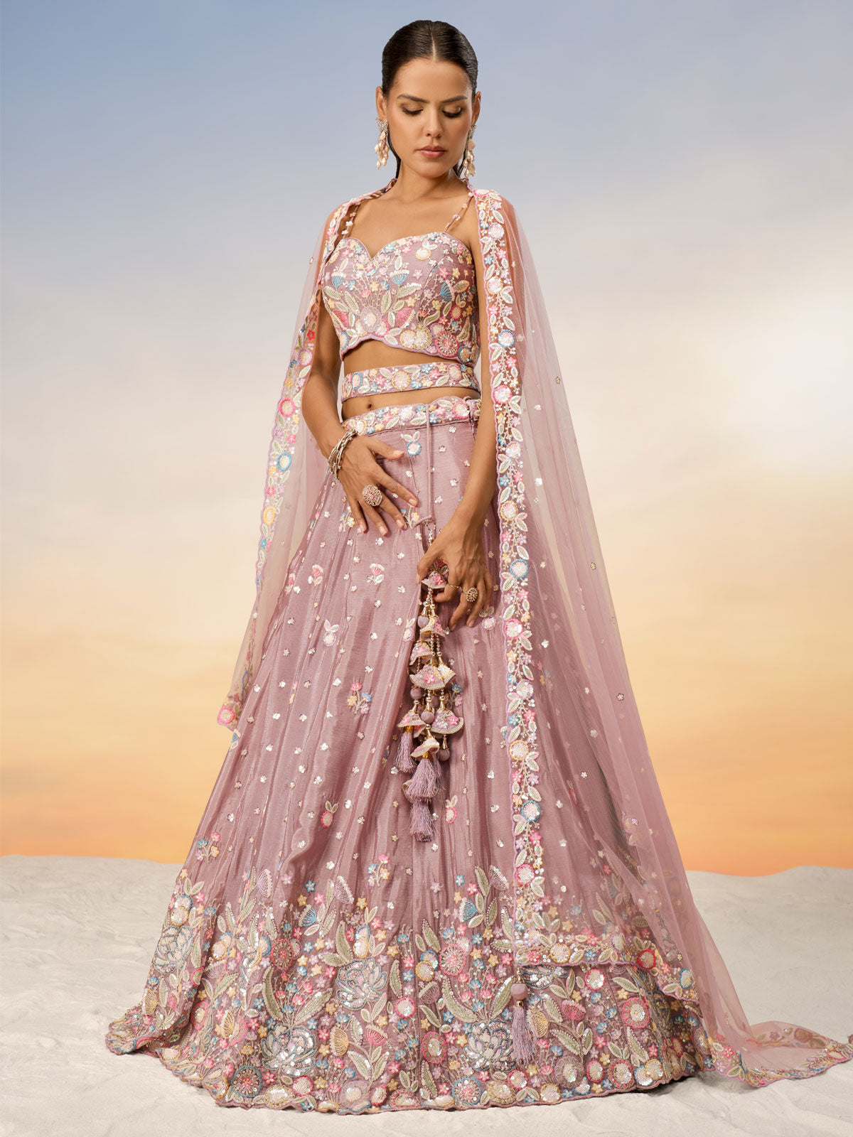 Be the center of attention in this exquisite Rose Gold Chiffon Sequins and thread embroidery Semi-Stitched Lehenga choli & Dupatta set. The premium quality fabric and intricate sequins and thread work add a touch of glamour. The lehenga comes with double shantoon inner and layers of can can and buckram, providing a perfect fit. Complete the look with the rose gold net dupatta and tassels, and the matching blouse with neckline embroidery and heavy sequins and thread embroidery. The 3.5 meter lehenga flair and detachable waist belt make it the perfect choice for any special occasion.