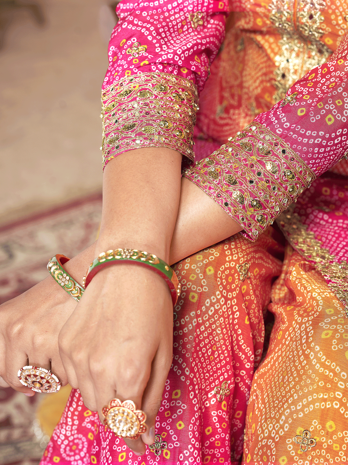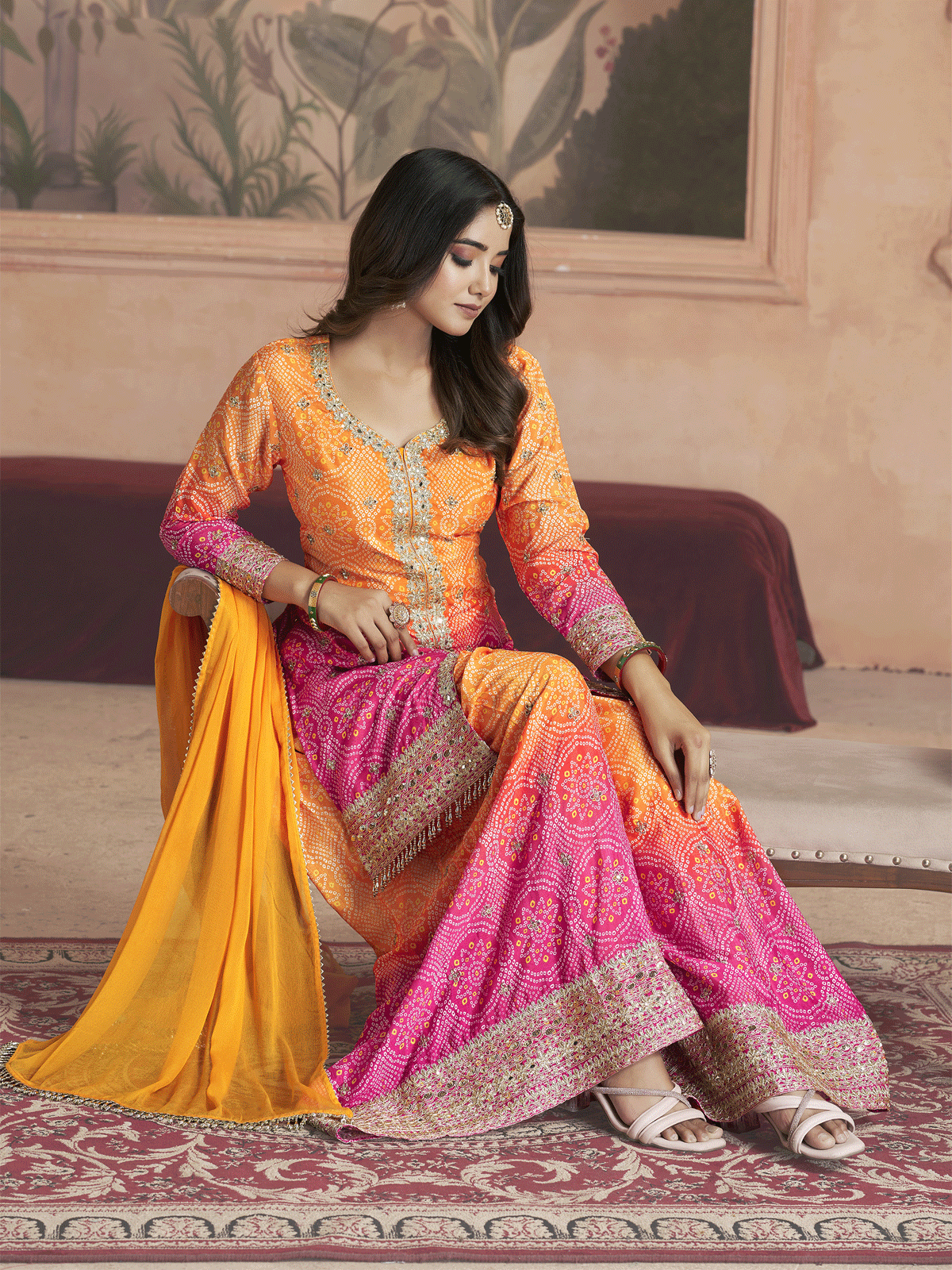 Elevate your ethnic wardrobe with this stunning yellow Bandhani printed kurta set. The kurta features a flattering straight silhouette with a V-neckline and three-quarter sleeves, complemented by a sequinned pocket detail and gracefully flared calf-length hem. Crafted from a luxurious silk blend of knitted and woven fabric, it offers both comfort and elegance. The coordinating printed palazzos feature an elasticated waistband with slip-on closure for effortless styling. Complete the ensemble with the included dupatta for a polished, traditional look. Ideal for festive occasions and celebrations. Hand wash recommended for longevity.