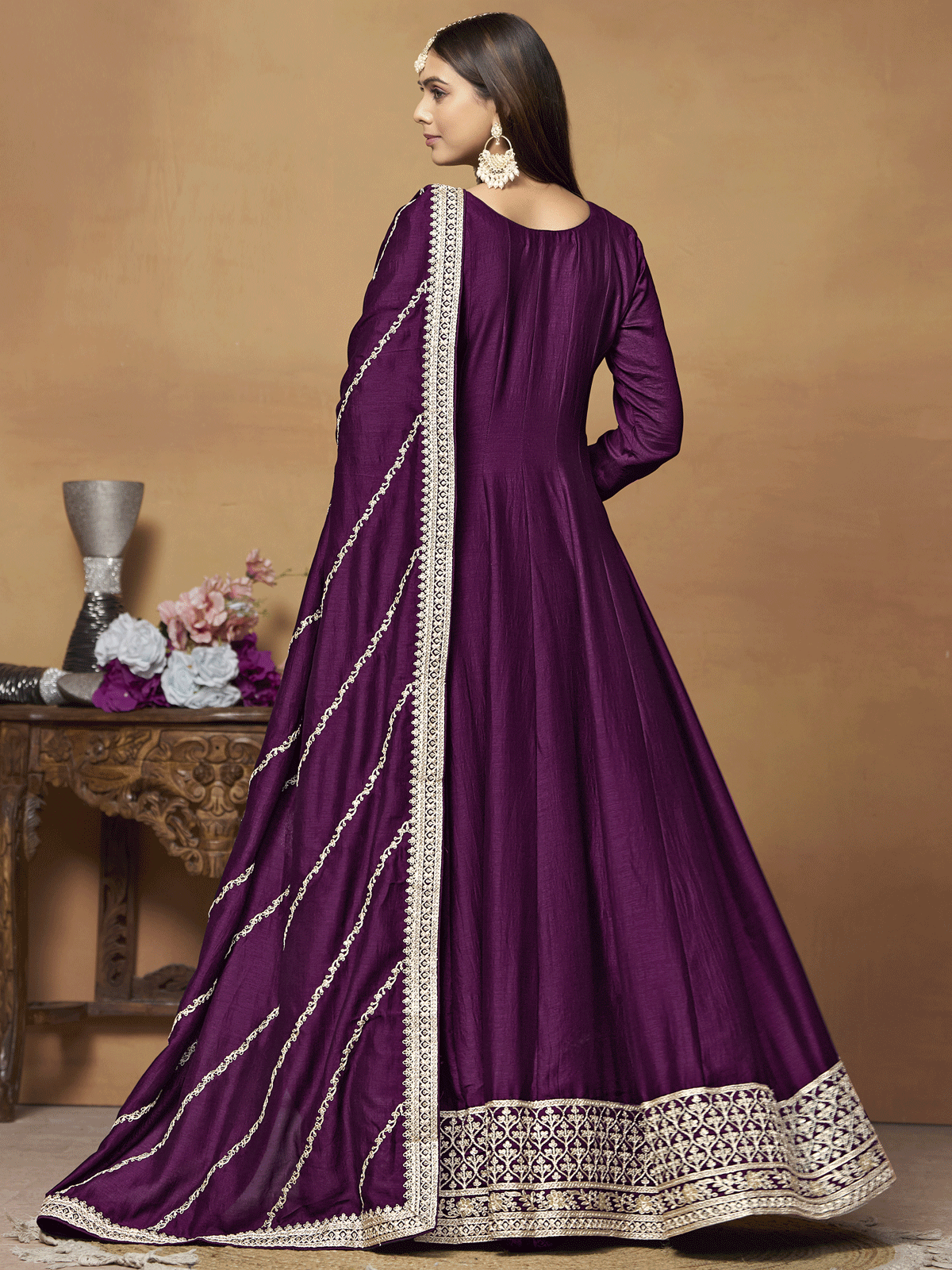 Indulge in luxury and style with our Purple Georgette Partywear Anarkali Suit. Made with high-quality georgette fabric, this stunning gown set is perfect for any special occasion. Complete with an art silk dupatta and santoon bottom, this suit is the epitome of elegance and grace. Shop now at Inddus and make a statement with our fabulous anarkali suit!
