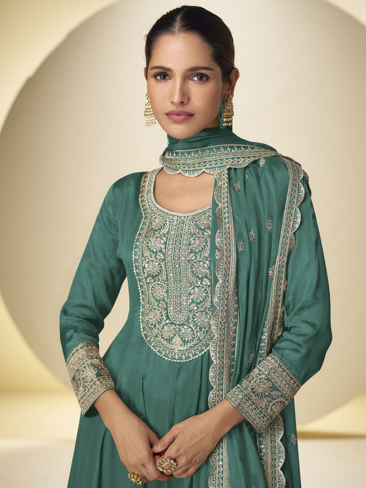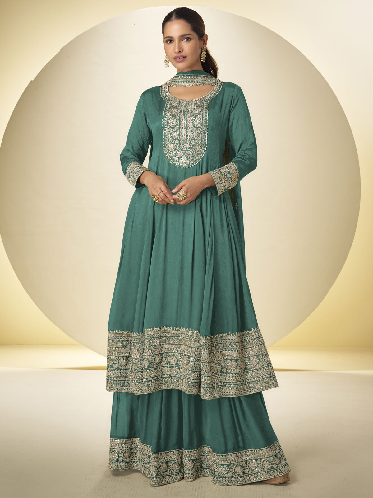 Celebrate in style with this Aqua Green Palazzo Suit from Inddus, expertly tailored from luxurious chinnon silk. The ensemble showcases meticulous sequin and thread embroidery work that delivers an understated luminescence, making it an exceptional choice for weddings, receptions, and festive occasions. Each piece—the kurta, palazzo pants, and coordinating dupatta—is designed to harmonize seamlessly, offering both traditional refinement and contemporary elegance. The premium fabric drapes beautifully while the detailed embellishments elevate your festive wardrobe. Pair with statement jewelry and complementary accessories to complete your sophisticated look for any special celebration.