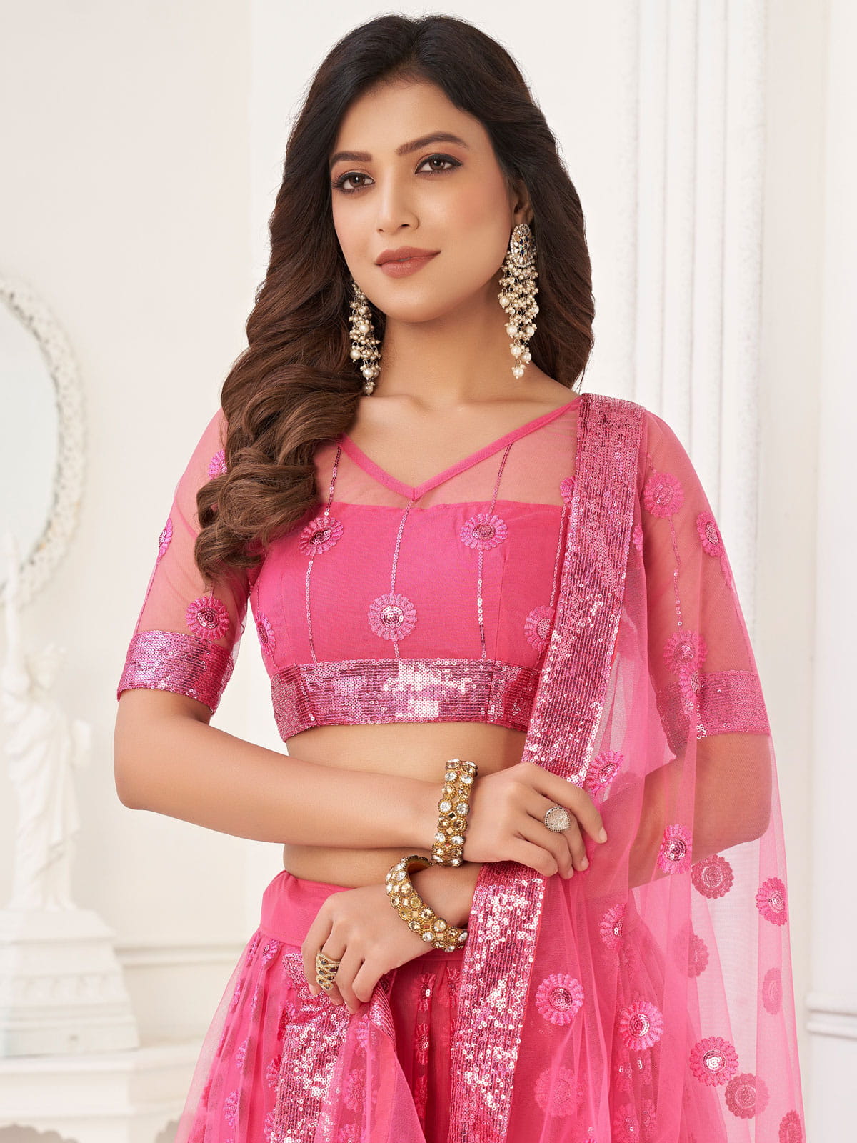 Be the center of attention at parties and special occasions with this stunning pink sequins net reception wear lehenga choli. The intricate sequin work and thread embroidery add an elegant touch to this semi-stitched set, with a 3-meter flair and adjustable up to 42 inches. The butterfly net choli and lace-adorned dupatta complete the look, all made from high-quality net fabric. You'll be sure to make a statement in style with this lehenga choli.
