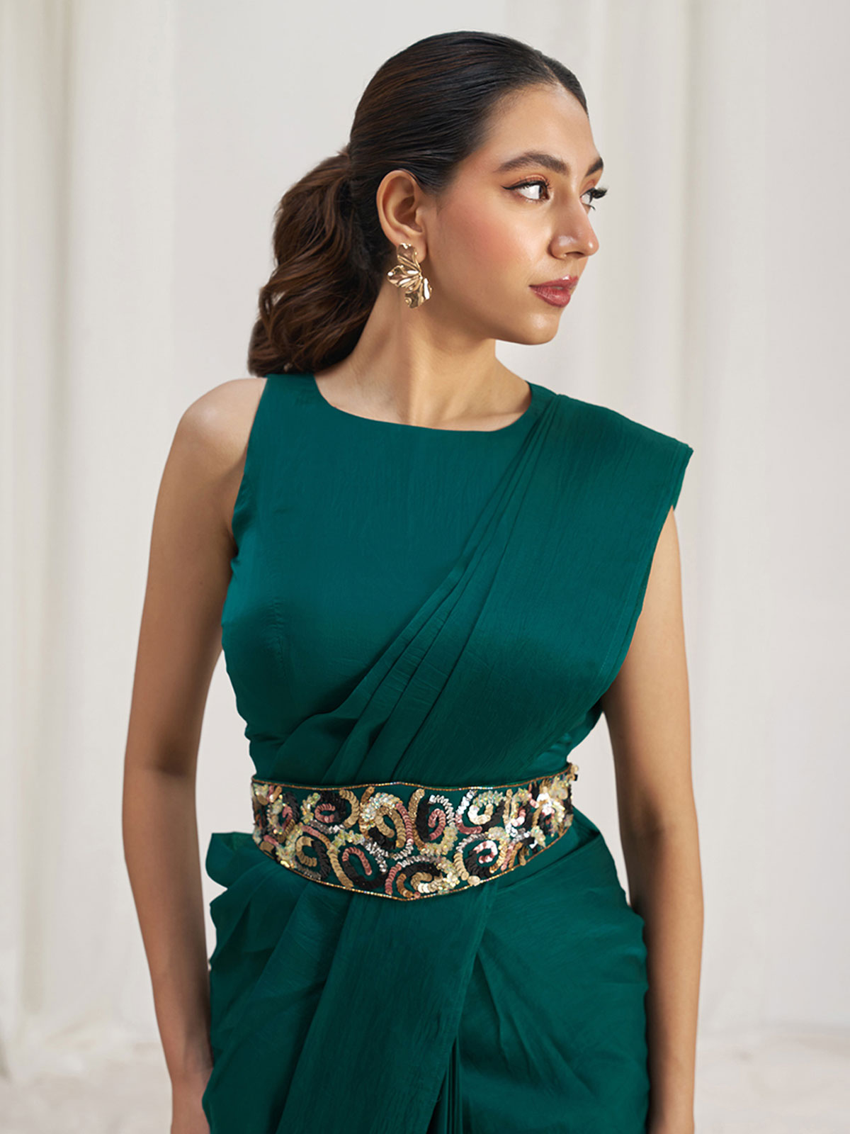 Experience effortless elegance with our Awesome Teal Green Organza Silk Ready To Wear Saree. The graceful drape and stylish sequins work waist belt add a chic touch. Paired with a matching blouse, it comes in sizes XS to XXL for a perfect fit. Perfect for special occasions, parties, and festivals.