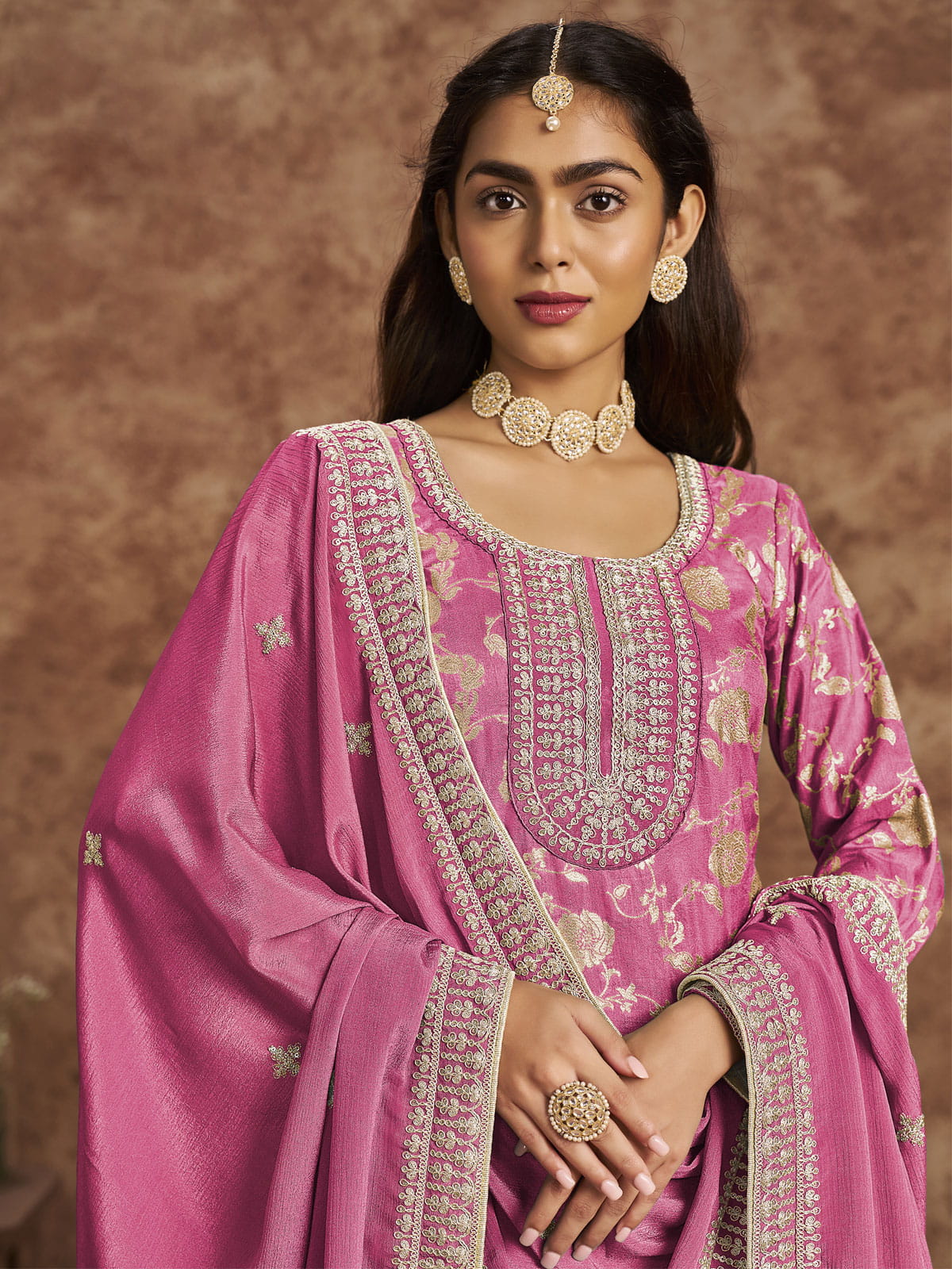 This Cherry Pink Dola Silk Jacquard Festive Salwar Kameez by Inddus blends classic design with contemporary style, making it the perfect choice for any elegant occasion. The exquisite thread embroidery and sparkling sequin work create a mesmerizing pattern, while the premium dola silk jacquard material ensures both luxury and comfort. Radiate elegance with this enchanting ensemble.