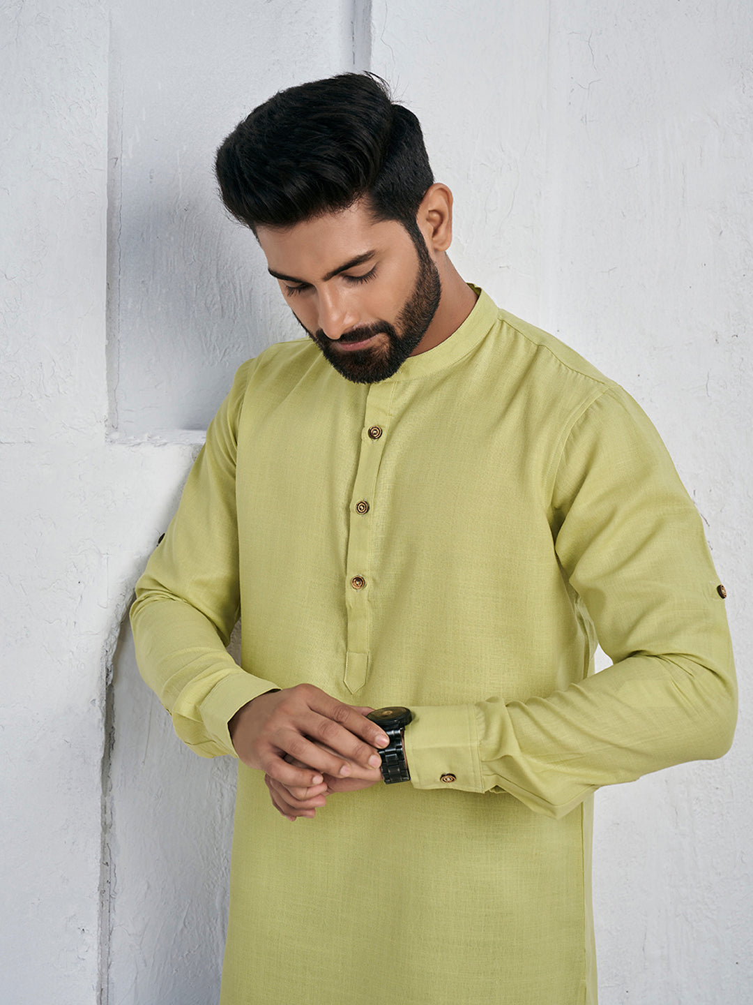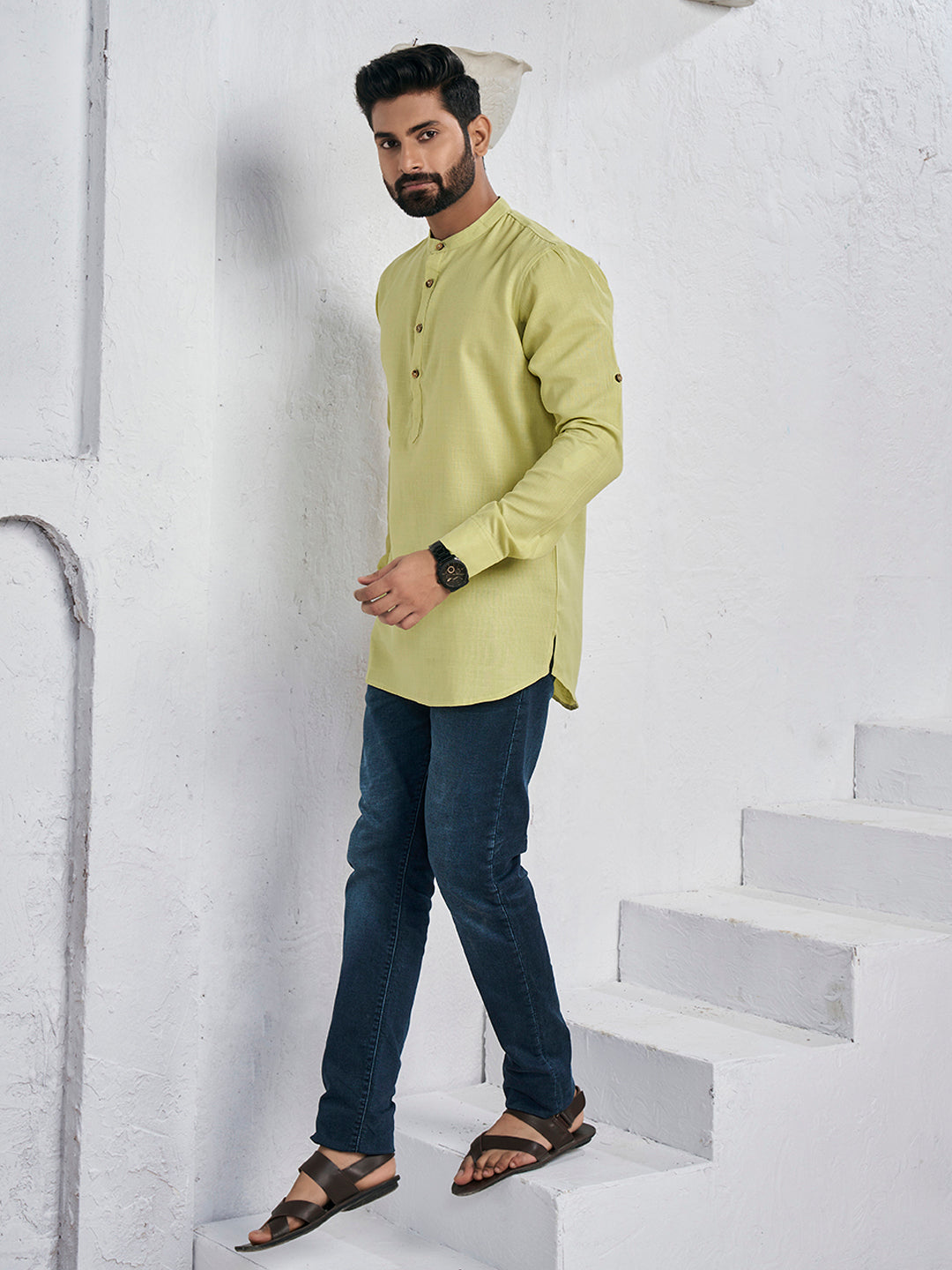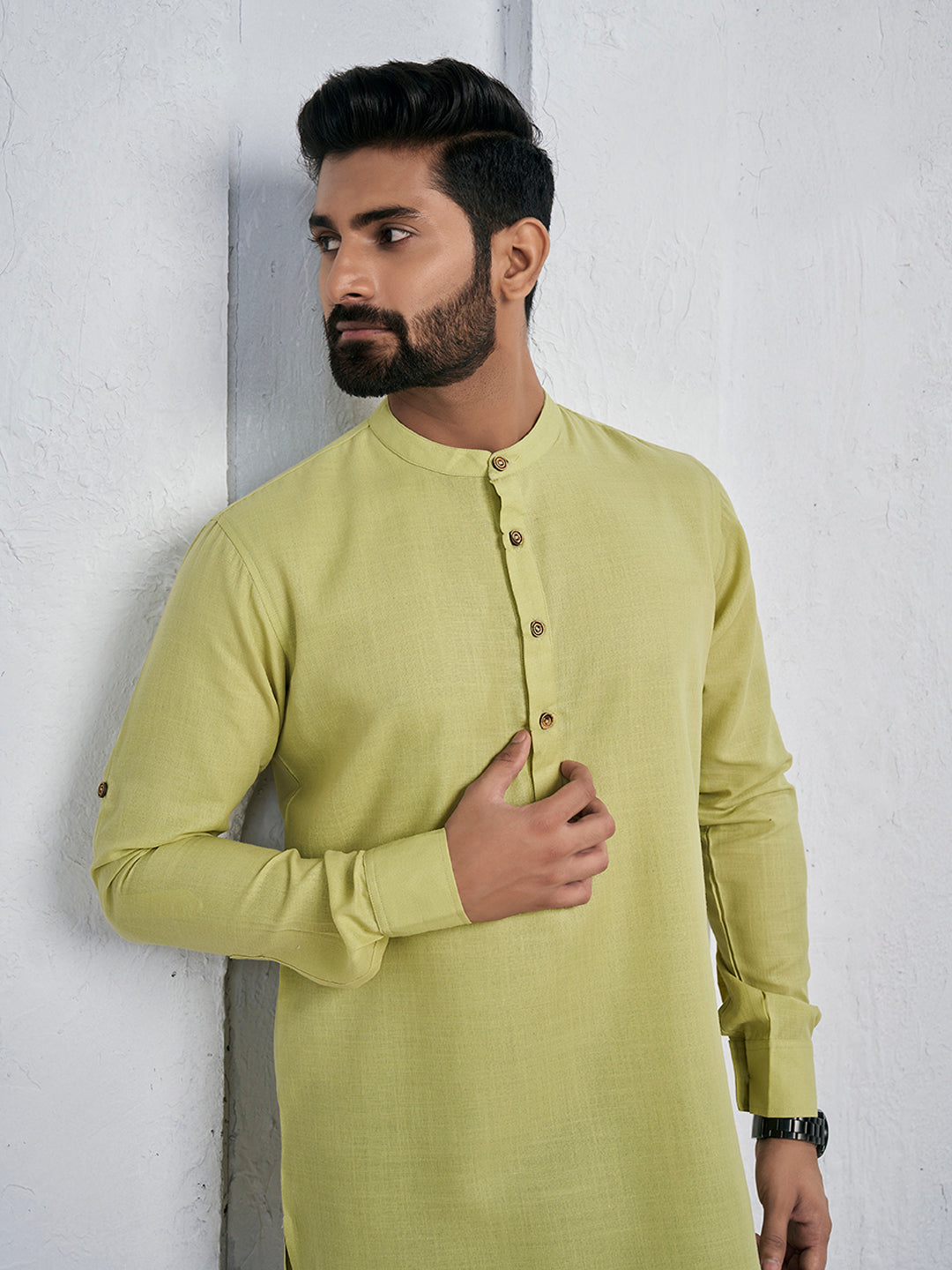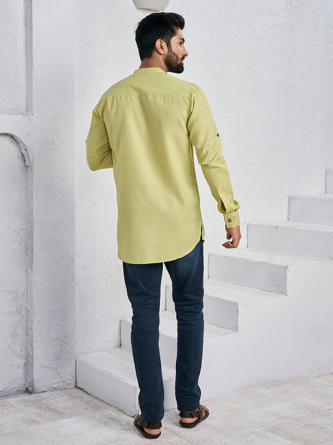 Expertly crafted in a solid green color, this Band Collar Straight Kurta is the perfect addition to your wardrobe. Featuring a band collar and long, regular sleeves, this kurta has a straight shape with a regular style and falls above the knee with a curved hem. Made from a machine-woven regular cotton material, it is comfortable and easy to care for with dry cleaning. Elevate your style with this versatile and durable kurta.