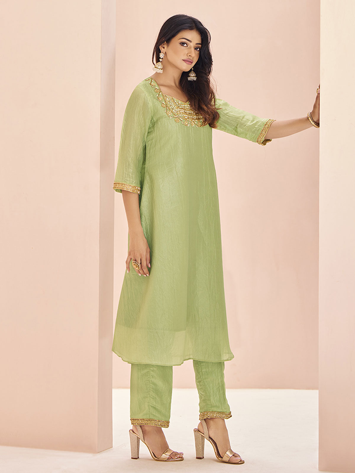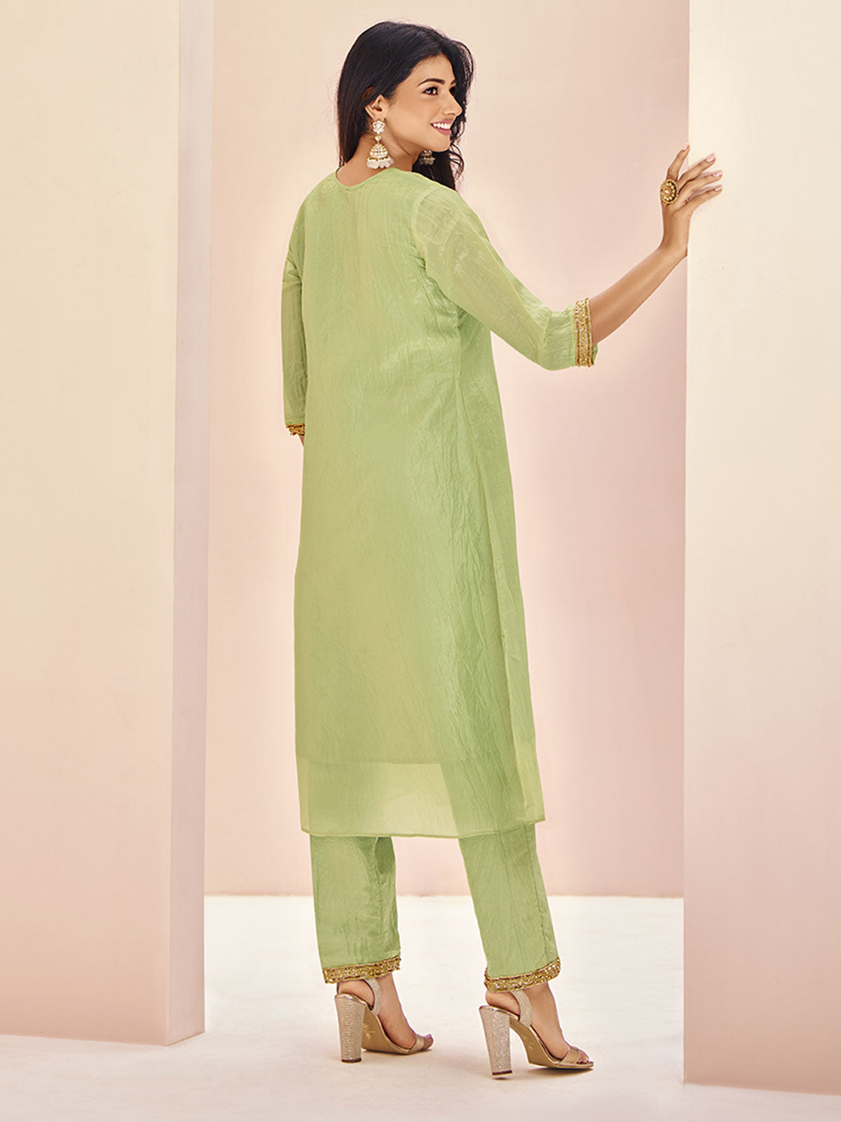 Elevate your style with our Beautiful Pista Green Embroidered Organza Pant Suit. Featuring intricate thread embroidery and sequin work, this fully-stitched suit is perfect for any occasion. The elegant pista green color and lace border add sophistication, while the high-quality fabric makes it stylish and comfortable. Available in sizes S to XXL.