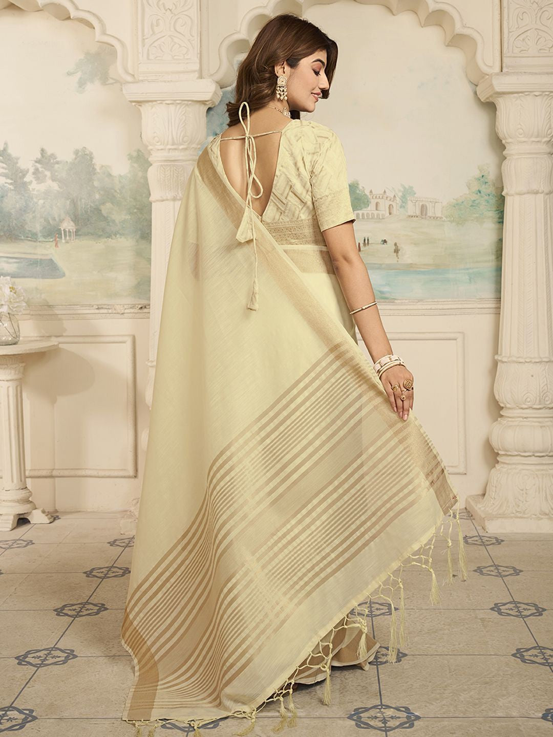 This exquisite Beige and Gold-Toned Zari Solid Saree is the perfect addition to your ethnic wardrobe. The solid color and zari border add a touch of elegance and the zari detail adds a touch of glamour. Made with high-quality materials, this saree comes with an unstitched blouse piece, allowing you to customize it to your liking. The actual blouse piece may differ from the one worn by the model.
