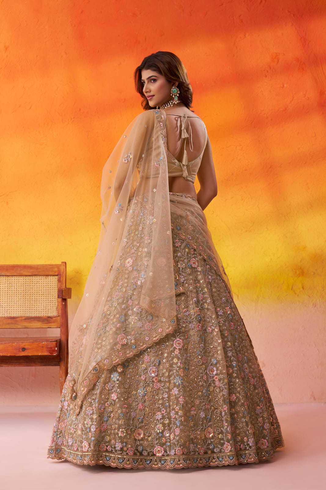 Elevate your ethnic wardrobe with this stunning beige net lehenga set, meticulously crafted for the discerning bride. The semi-stitched lehenga features an impressive 3.5-meter flare with intricate sequin work, stone embellishments, and detailed thread coding throughout. A decorative thread cutwork border adorns the hemline, while the structured inner includes a single Shantoon layer with 18-inch Can Can and dual layers of Buckram for perfect volume and drape. The matching beige net dupatta showcases heavy coding and embroidery with an ornate cutwork border. The unstitched V-neck blouse in beige net is adorned with luxurious sequins, elaborate coding, and thread embroidery, complete with an attached Shantoon inner for comfort. This semi-stitched ensemble combines traditional craftsmanship with contemporary design, ready for customization to your exact measurements.