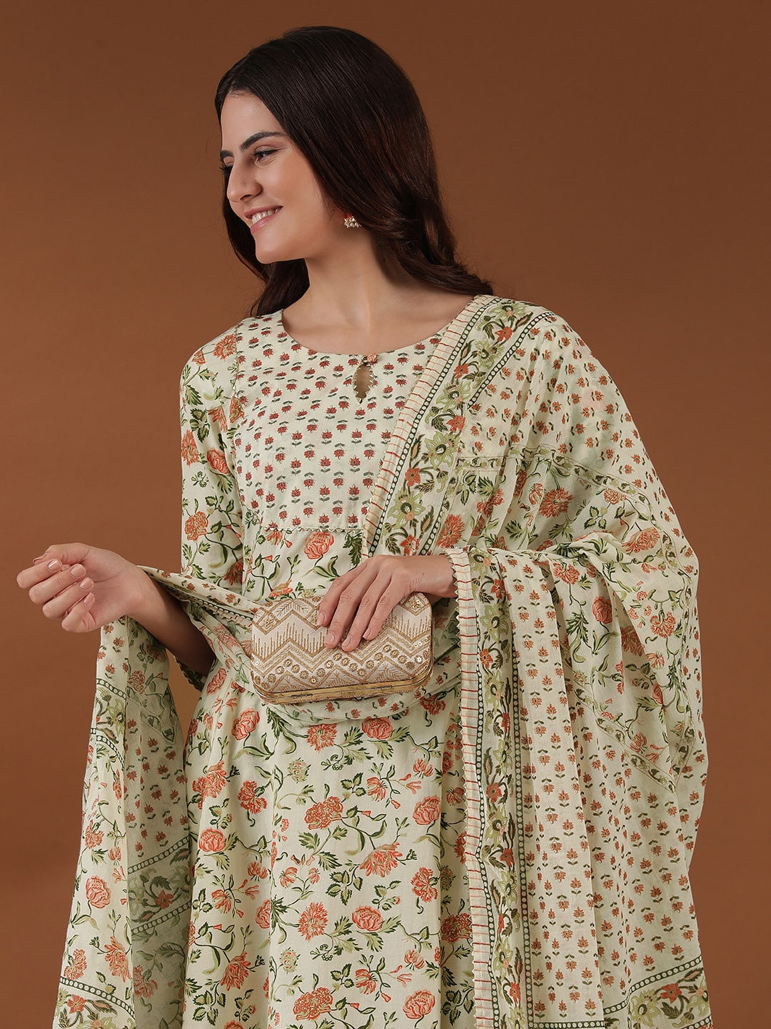 This beige floral printed Kurta set features an A-line silhouette with a flattering empire waist and elegant notched neck. The kurta is adorned with intricate gotta patti detailing and has three-quarter regular sleeves. Paired with printed dhoti pants and a dupatta, this set is made from a comfortable cotton blend fabric for a stylish and comfortable look.