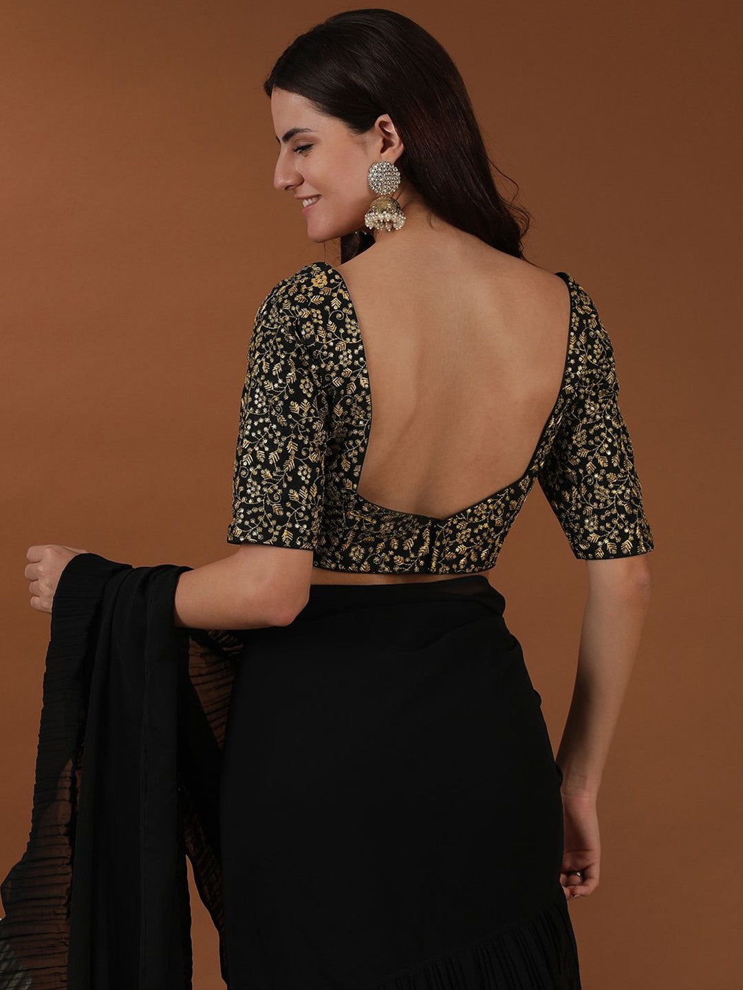 This elegant black saree features a sleek solid design with no border, giving it a sophisticated and timeless look. Made from high-quality fabric, it drapes beautifully on the body. It also comes with an unstitched blouse piece, allowing you to customize it to your unique style. A must-have for any formal or special occasion.