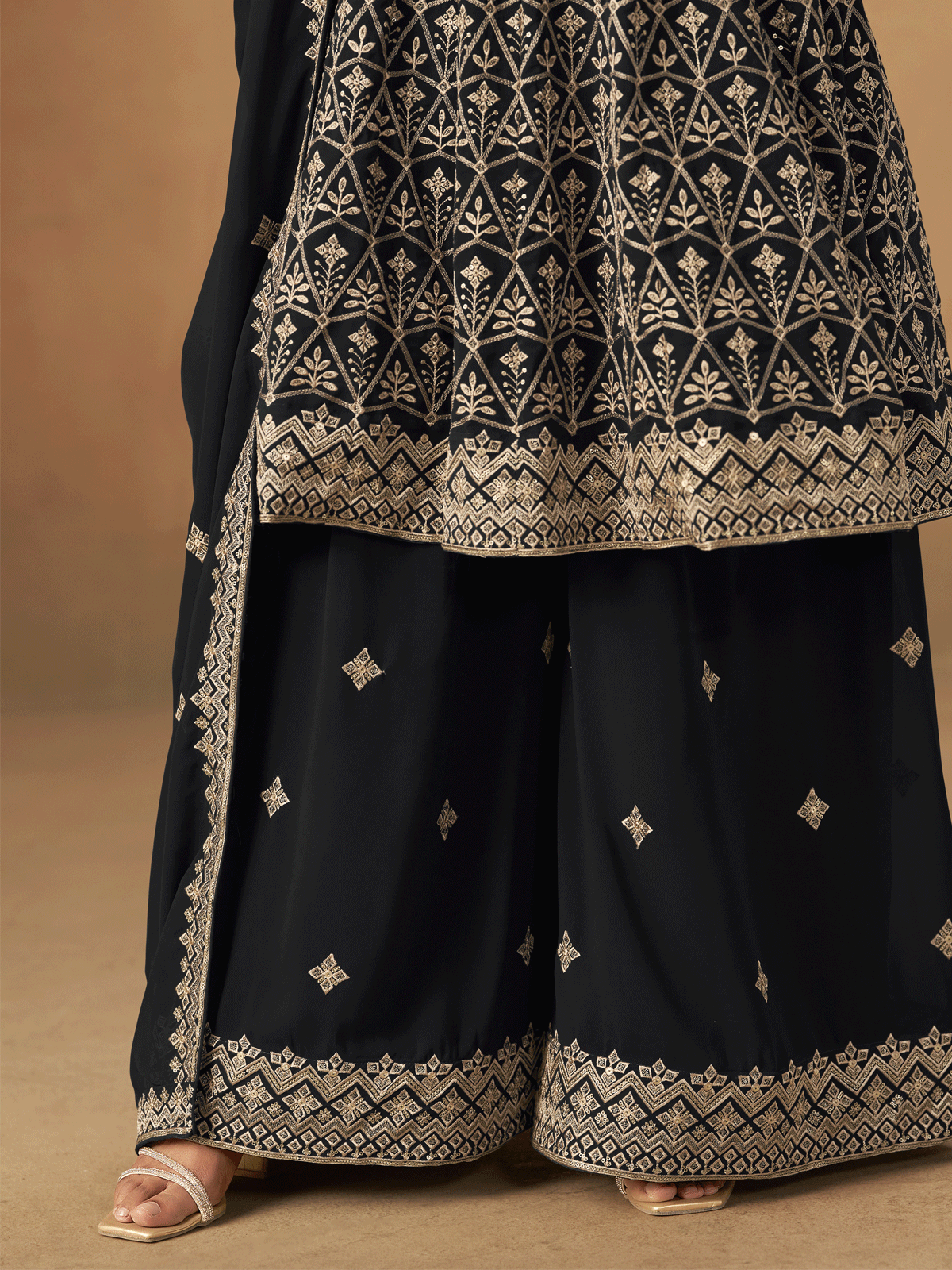 This black palazzo suit exemplifies sophisticated festive elegance through its meticulous craftsmanship. Constructed from premium faux georgette, the ensemble features intricate zari and sequin embellishments that create a refined geometric pattern across the kurta's front and back. The coordinated embroidery extends seamlessly onto the palazzo pants and dupatta, establishing visual harmony throughout the three-piece set. The deep black base amplifies the luminous quality of the metallic zari work, delivering a luxurious aesthetic ideal for celebrations and formal occasions. Each embroidered motif reflects traditional artistry while maintaining contemporary appeal, making this suit a versatile choice for discerning wearers seeking understated opulence.