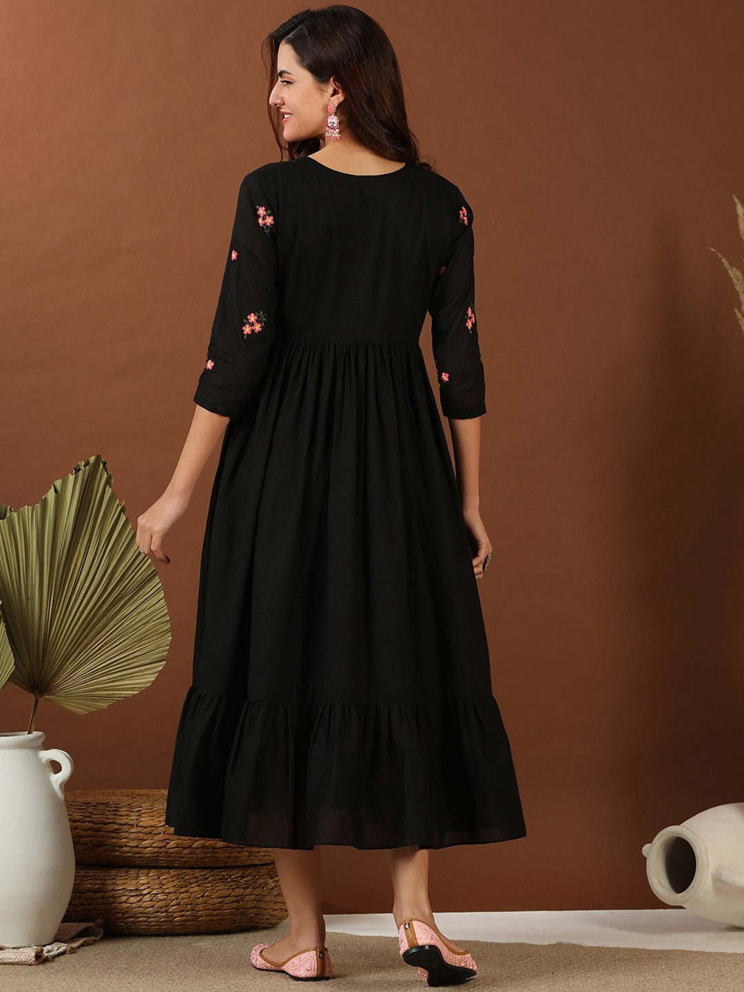 This black midi ethnic dress features stunning floral embroidery, a flattering fit and flare shape, and a v-neckline with elegant three quarter sleeves. The flared hem adds a touch of femininity, and the slip-on closure makes it easy to wear. Stand out in this timeless and effortlessly chic dress.