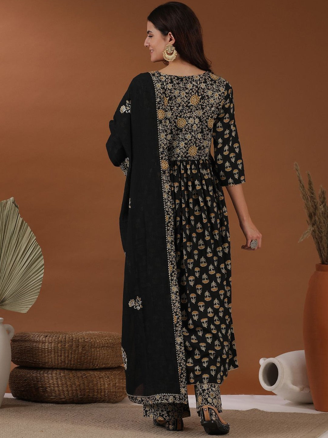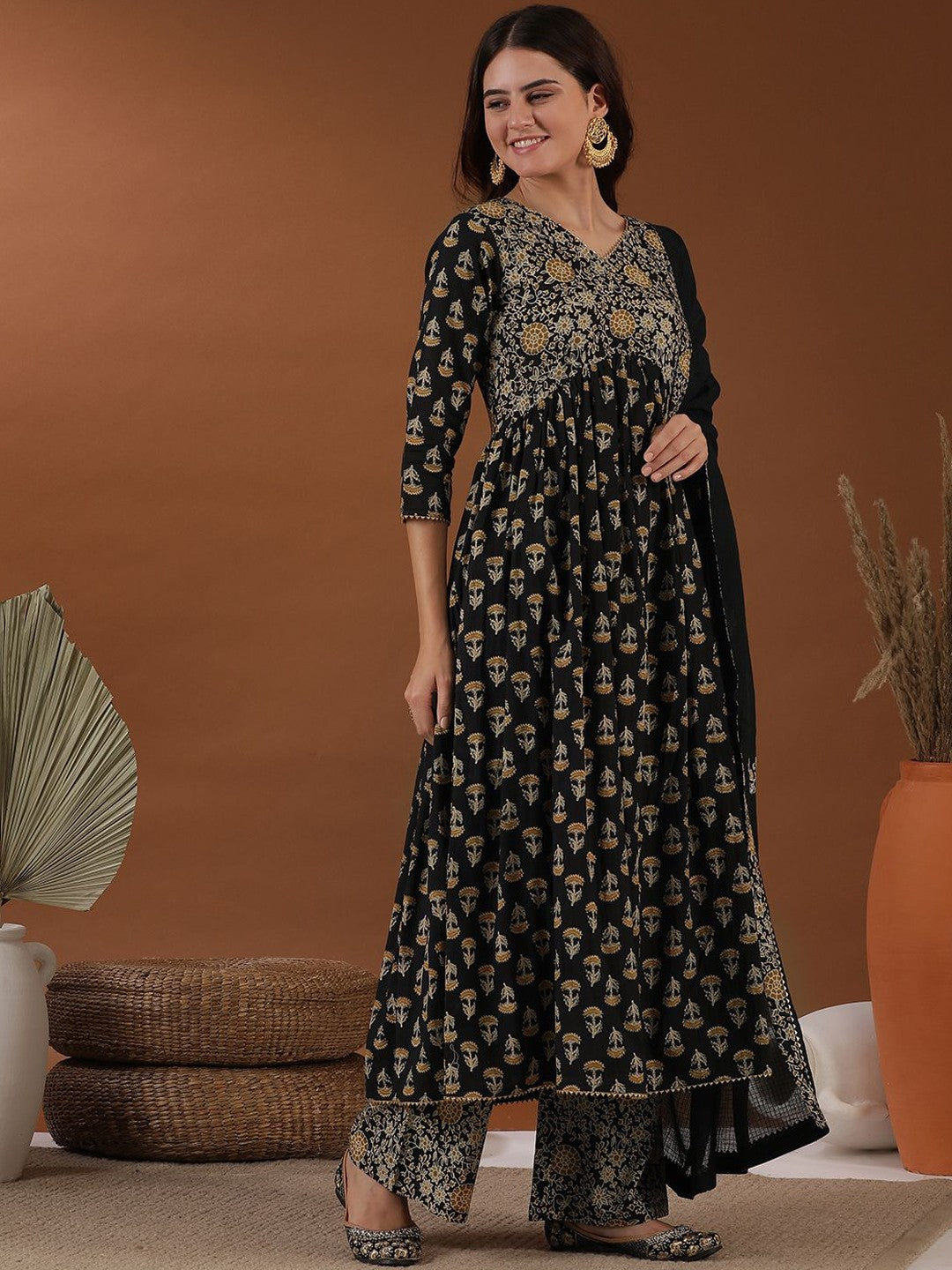 This Black Floral Printed Thread Work A-Line Kurta with Palazzos and Dupatta is a must-have for your wardrobe. Made with a cotton blend machine weave fabric, the floral print and thread work detail add a touch of elegance. The A-line shape, three-quarter sleeves, and calf length with flared hem make it a perfect choice for any occasion. The printed Palazzos with partially elasticated waistband and slip-on closure provide comfort and style. The embroidered dupatta adds a beautiful finishing touch, making it a versatile and stylish outfit.