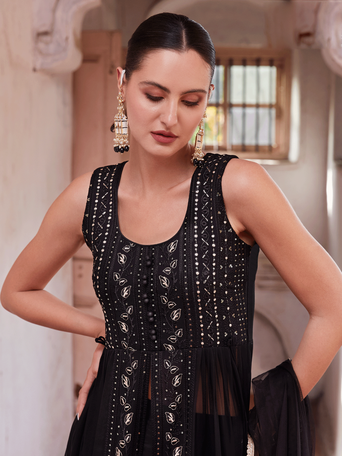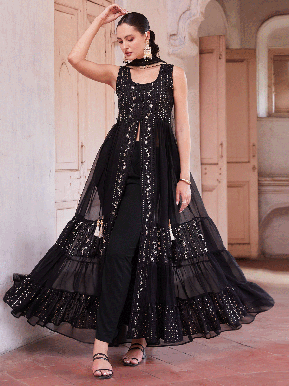 Turn heads and steal the show with Inddus Black Front Slit Style Pant Style Party Wear Suit. Made with high-quality Georgette and adorned with elegant zari, thread, and sequin embroidery, this attire is perfect for weddings, parties, and formal events. Complete the look with matching pants bottom & net dupatta and stand out with modern jewelry and accessories. Comfort and style combined in one stunning outfit.