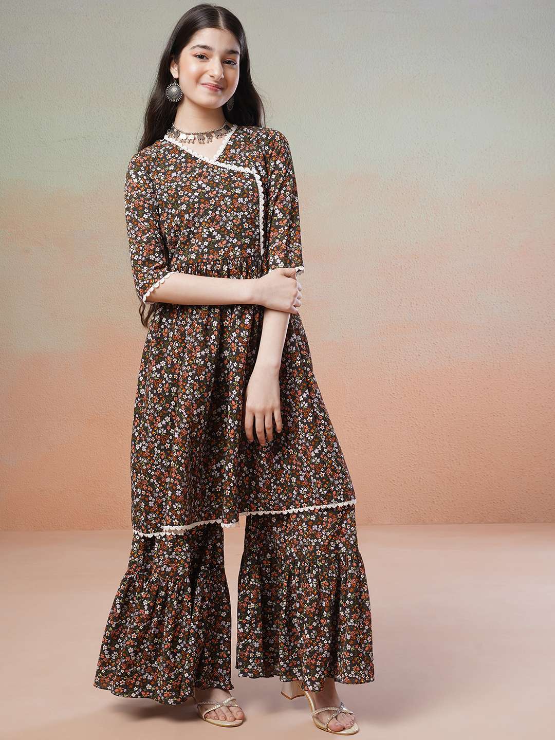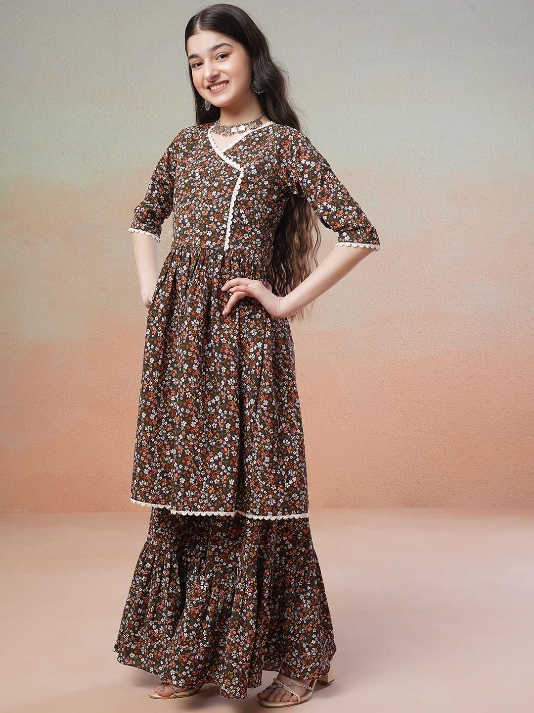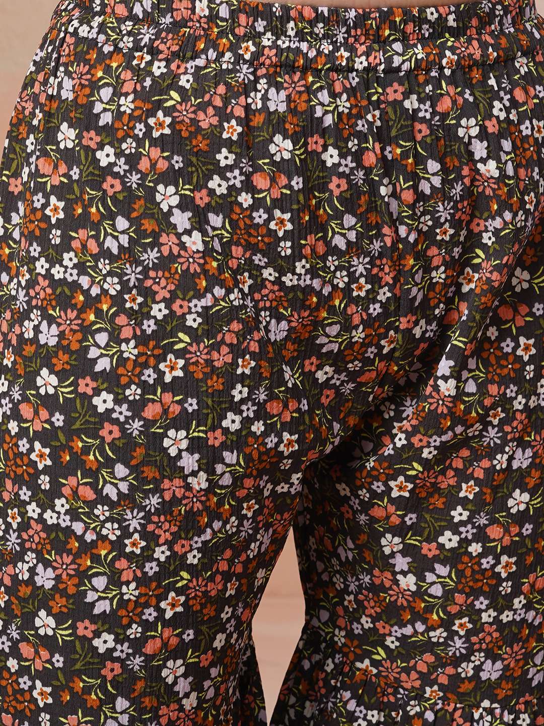 This black Kurta with Sharara has a beautiful floral print and an A-line shape for a flattering fit. The Angrakha style and V-neck add a touch of elegance, while the short regular sleeves and knee length with flared hem provide comfort and versatility. Made of poly crepe fabric, it has a soft, lightweight feel and is machine-washable. The matching printed Sharara has an elasticated waistband and slip-on closure for easy wear. Elevate your wardrobe with this stylish and functional ensemble.