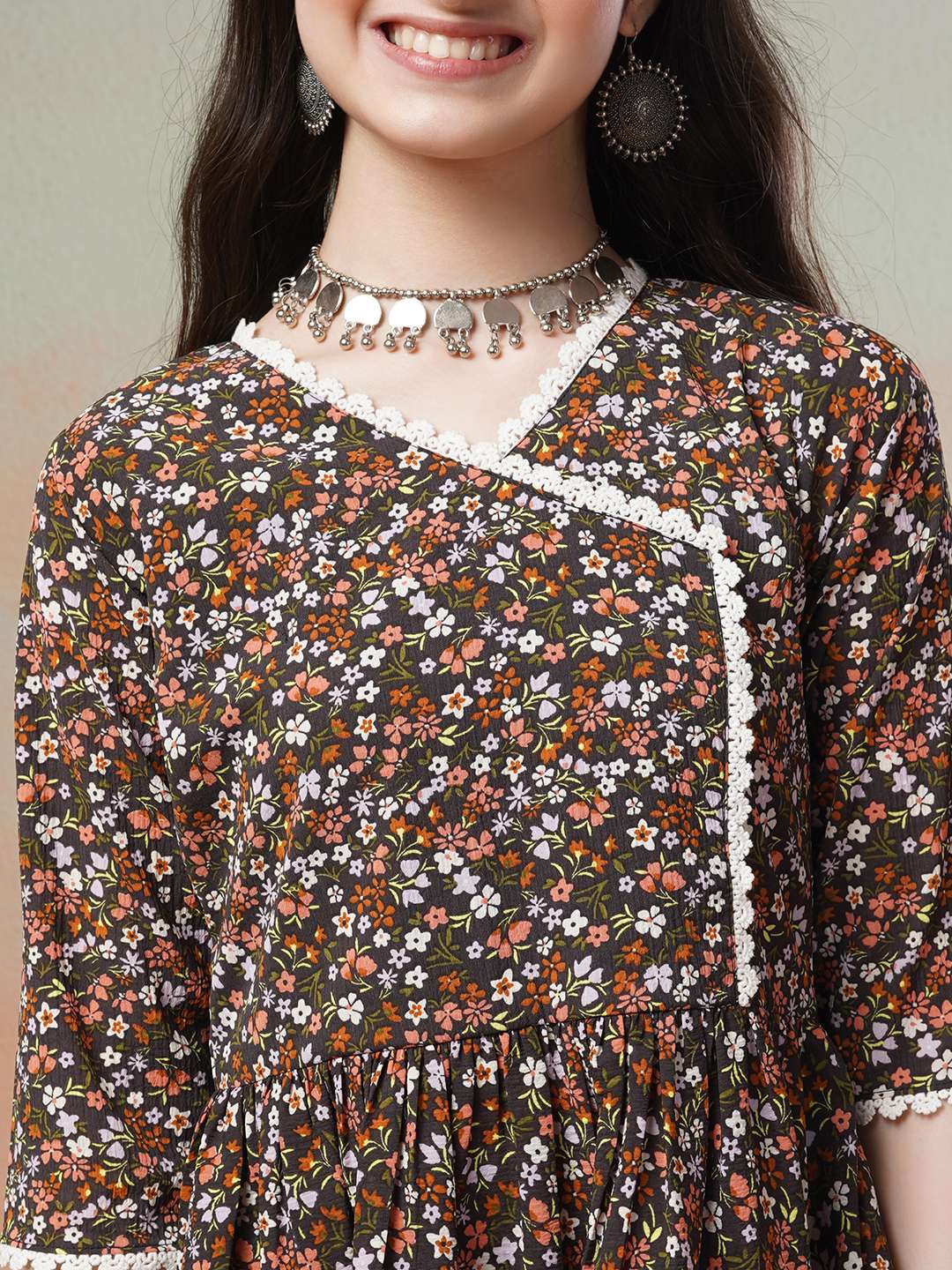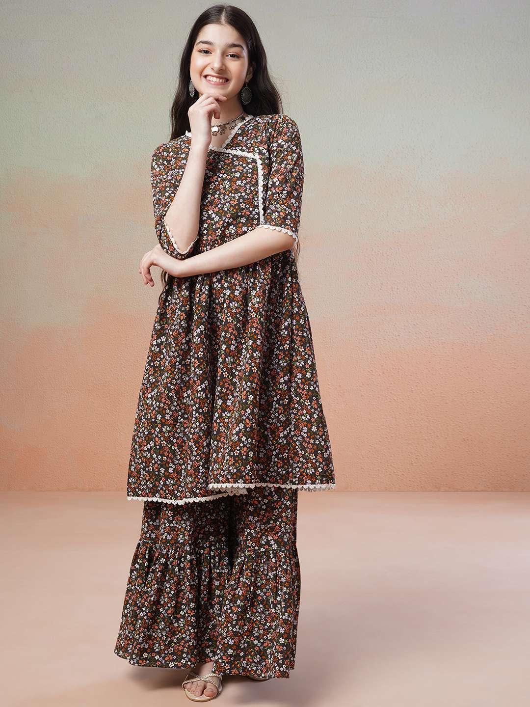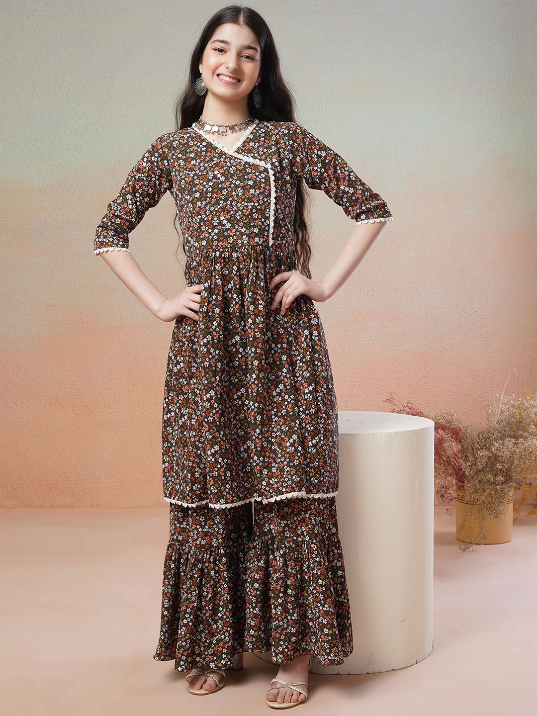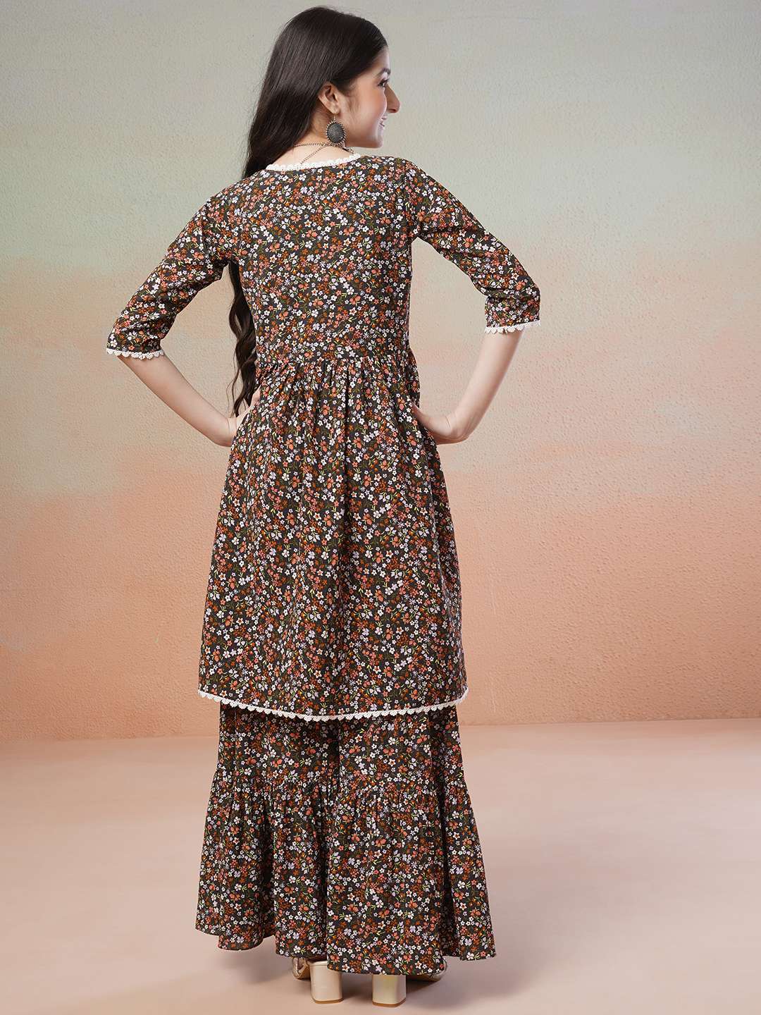 This black Kurta with Sharara has a beautiful floral print and an A-line shape for a flattering fit. The Angrakha style and V-neck add a touch of elegance, while the short regular sleeves and knee length with flared hem provide comfort and versatility. Made of poly crepe fabric, it has a soft, lightweight feel and is machine-washable. The matching printed Sharara has an elasticated waistband and slip-on closure for easy wear. Elevate your wardrobe with this stylish and functional ensemble.