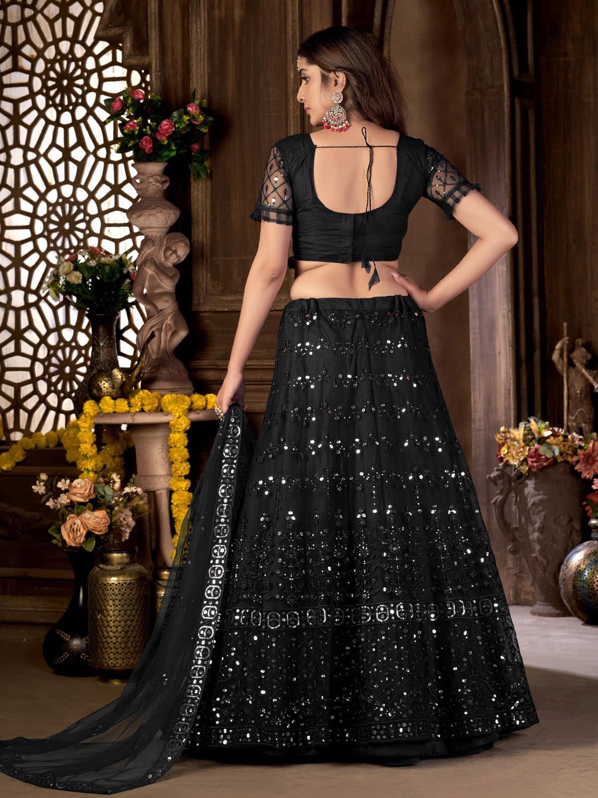 This Black Net Embroidered A-Line Lehenga combines fashion and style with its beautiful color and fantastic combination of shades. The embroidered, foil print, and mirror work add a touch of elegance to your appearance. Stand out in this smashy lehenga choli and enhance your beauty and personality. Comes with a matching choli and dupatta.