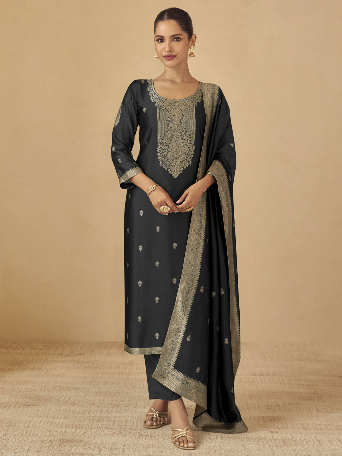 Elevate your ethnic wardrobe with this sophisticated salwar suit crafted from premium viscose silk. The ensemble features a beautifully tailored top paired with matching viscose silk trousers and a graceful dupatta, delivering an effortless blend of comfort and elegance. Perfect for celebrations, gatherings, or everyday wear, this black piece showcases the luxurious drape and breathable qualities that viscose silk is renowned for. A timeless addition to any traditional collection.