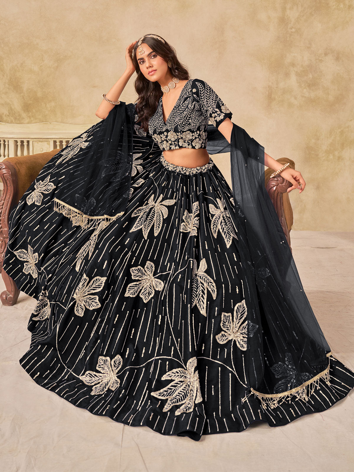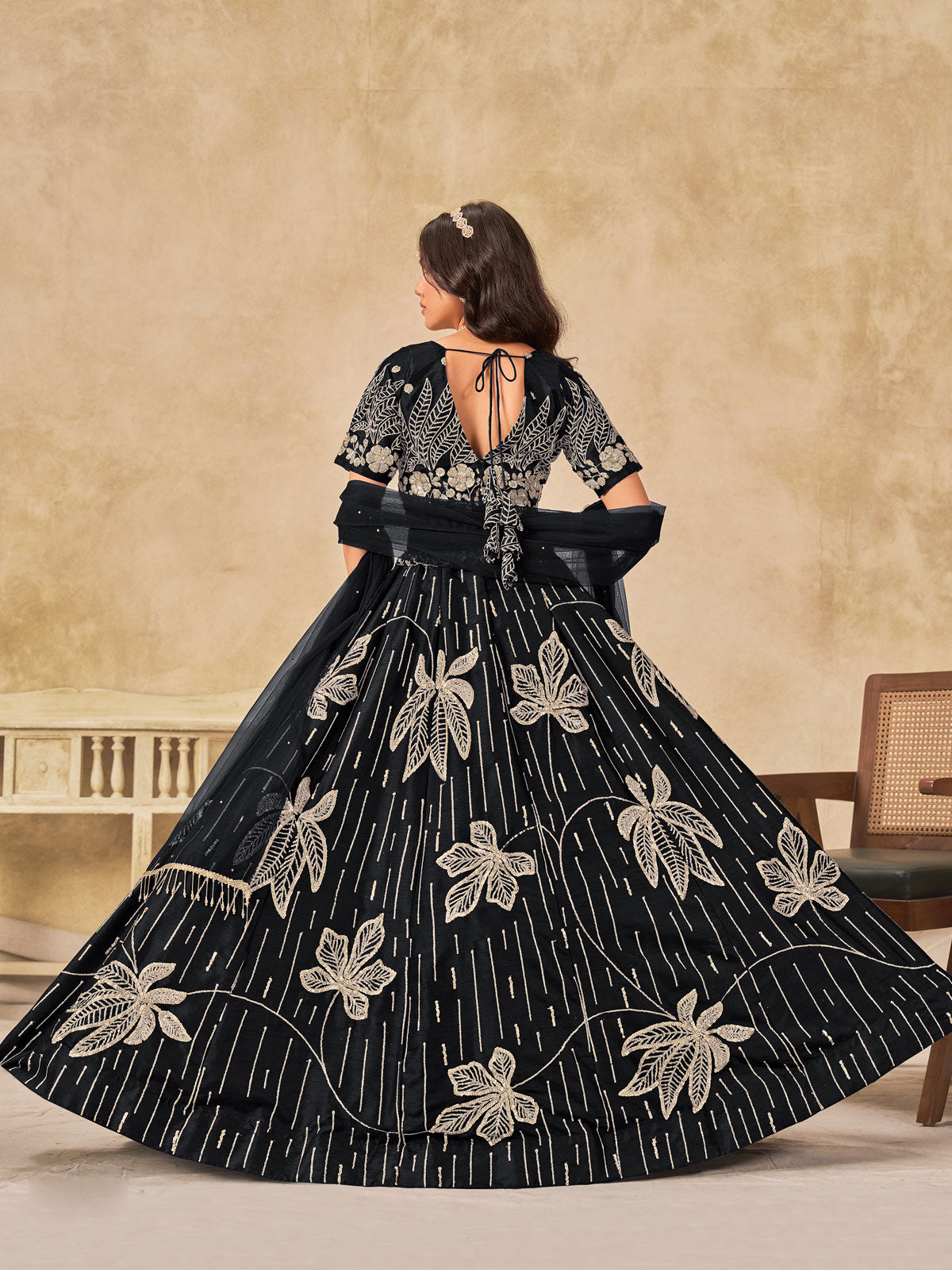 Black art silk umbrella lehenga that epitomizes timeless elegance for weddings and celebrations. The gracefully flared silhouette creates a dramatic drape with every movement, while delicate sequin embellishments add refined sparkle without compromising the fabric's sophisticated appeal. The V-neck blouse, designed at both front and back, flatters the neckline beautifully, while half sleeves balance the rich black tone perfectly. A natural waistline with adjustable drawstring ensures a secure, comfortable fit throughout your event. This ensemble combines luxurious drape with understated glamour, making it an ideal choice for those seeking refined wedding wear.