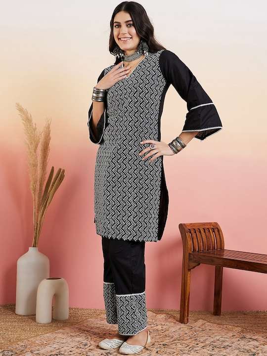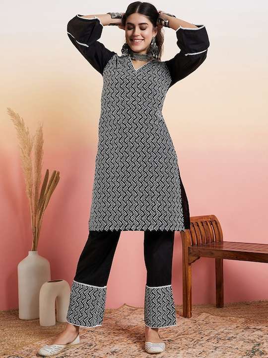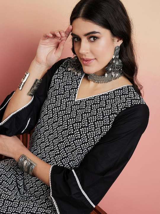 This Black & White Floral Embroidered Kurta with Trouser is a stylish addition to your wardrobe. The floral embroidery adds a touch of elegance, while the straight shape and regular style make it comfortable to wear. The V-neck and three-quarter flared sleeves create a flattering silhouette, and the knee-length with a straight hem adds a modern touch. The trousers feature a partially elasticated waistband and slip-on closure for convenience. Made from a cotton blend machine-woven fabric, this kurta and trouser set is perfect for any occasion.