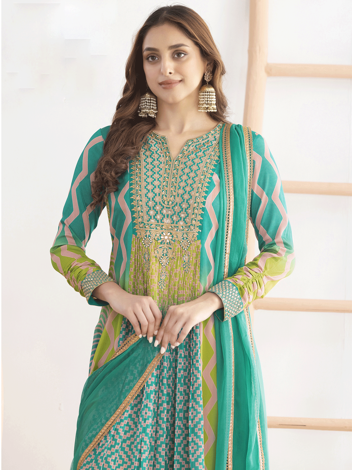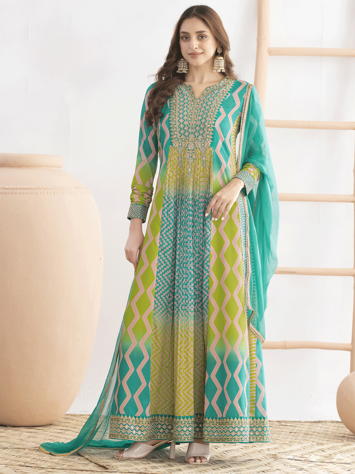Elevate your festive wardrobe with this stunning blue and lime green chinnon anarkali suit, expertly crafted for special occasions. The ensemble features intricate dabka dori and resham embroidery showcasing traditional motifs, complemented by an eye-catching Indian lehriya digital print that adds contemporary flair. The suit arrives complete with a coordinated bottom and dupatta, offering a polished, ready-to-wear look. Pre-stitched in size 42 with a comfortable free-fit silhouette, the plain back design provides versatile styling options. Perfect for weddings, parties, ceremonies, and evening functions, this piece seamlessly blends heritage craftsmanship with modern aesthetics. Custom tailoring available up to size 42 upon request.
