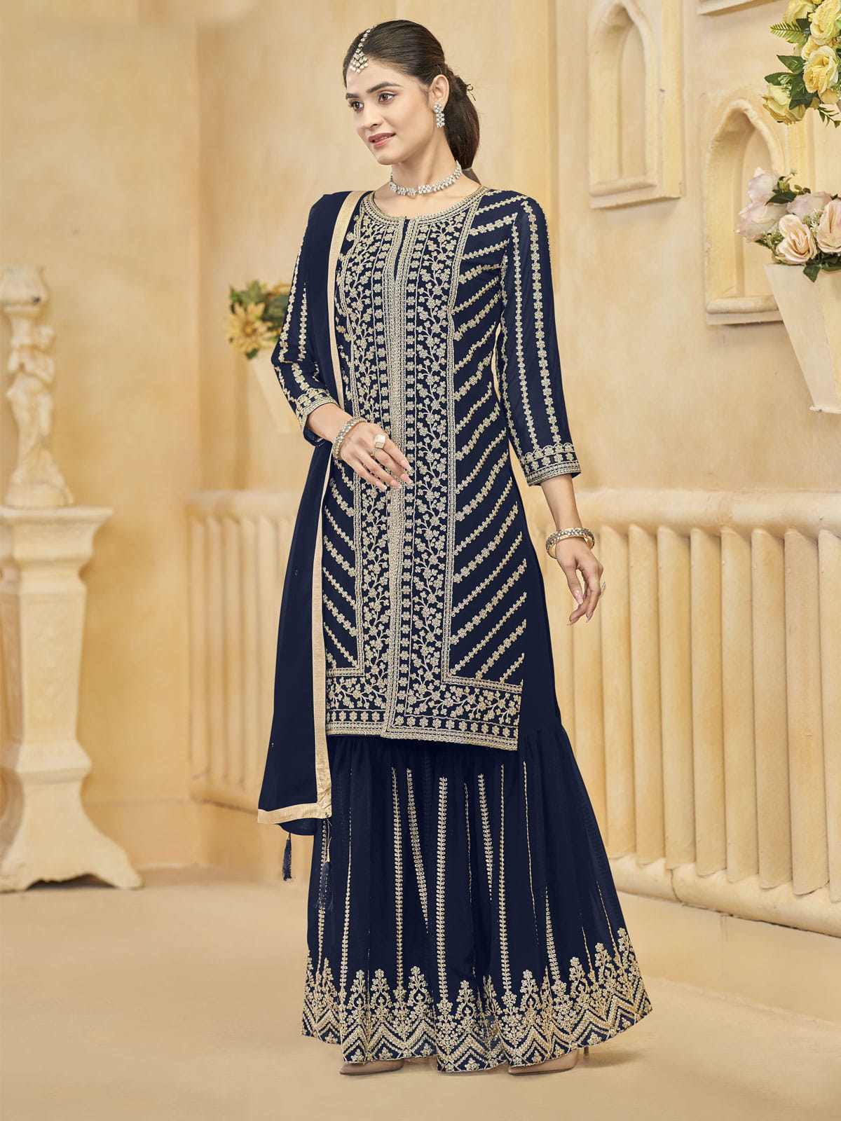 Step into elegance with Inddus' Blue Embroidered Sharara Suit. Adorned with zari thread embroidery and shimmering sequins, this Faux Georgette ensemble exudes grace and charm. Perfect for festive and party events, the rich blue hue enhances its regal appeal. Complete your look with statement jewelry for a dazzling presence.