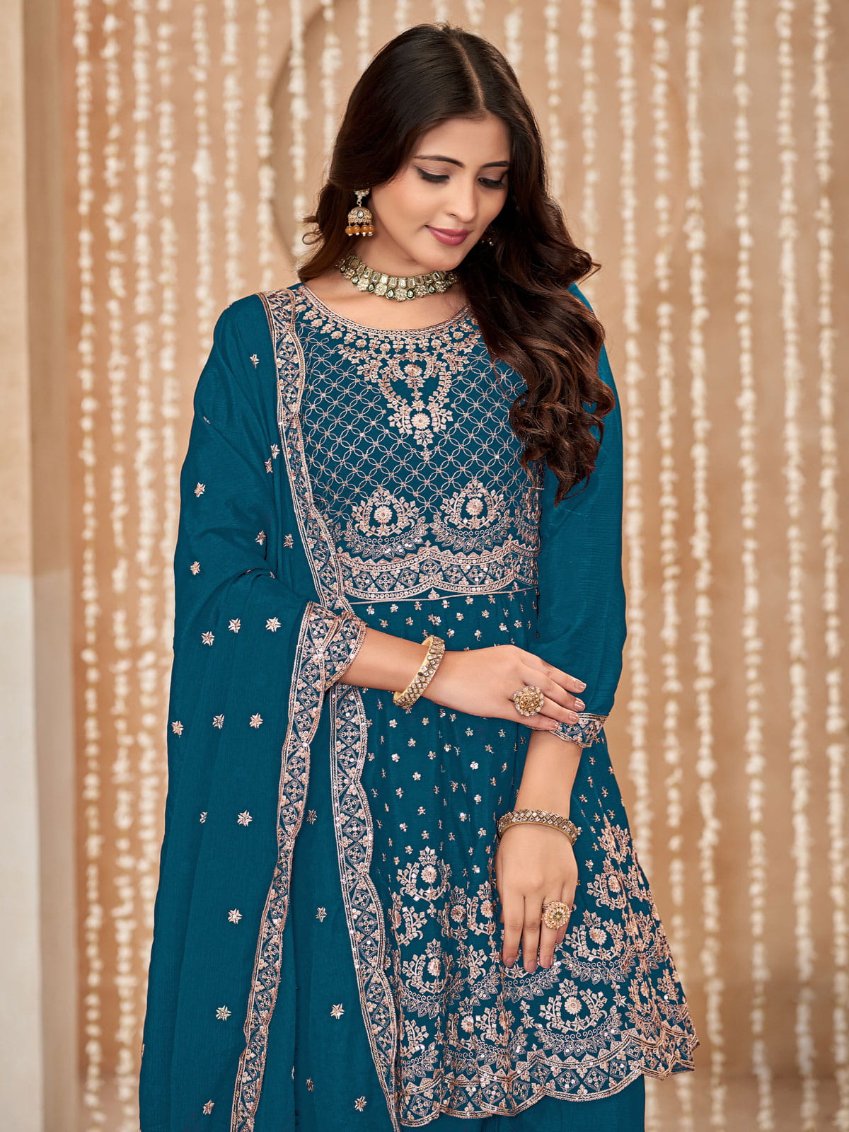 Elevate your festive and wedding style with our Palazzo Style Blue Embroidered Suit by Inddus. Made with luxurious chinnon material and adorned with intricate zari thread and sequins work, this suit exudes elegance and sophistication. Complete the look with the matching bottom and dupatta for a statement ensemble. Perfect for any traditional event, make a lasting impression with this timeless and versatile palazzo salwar suit.