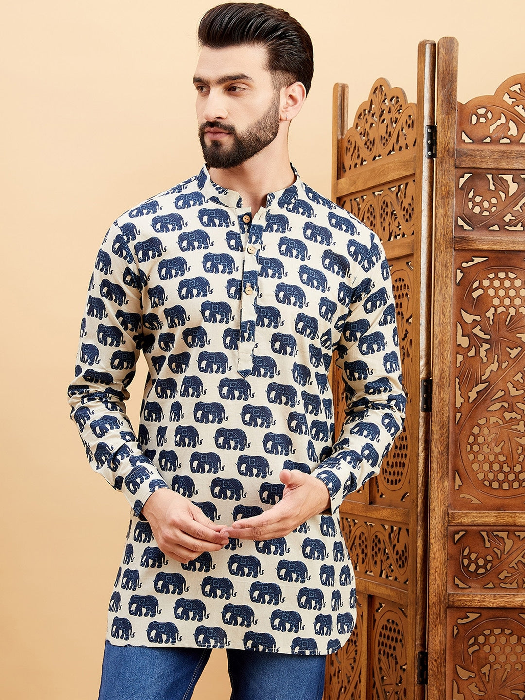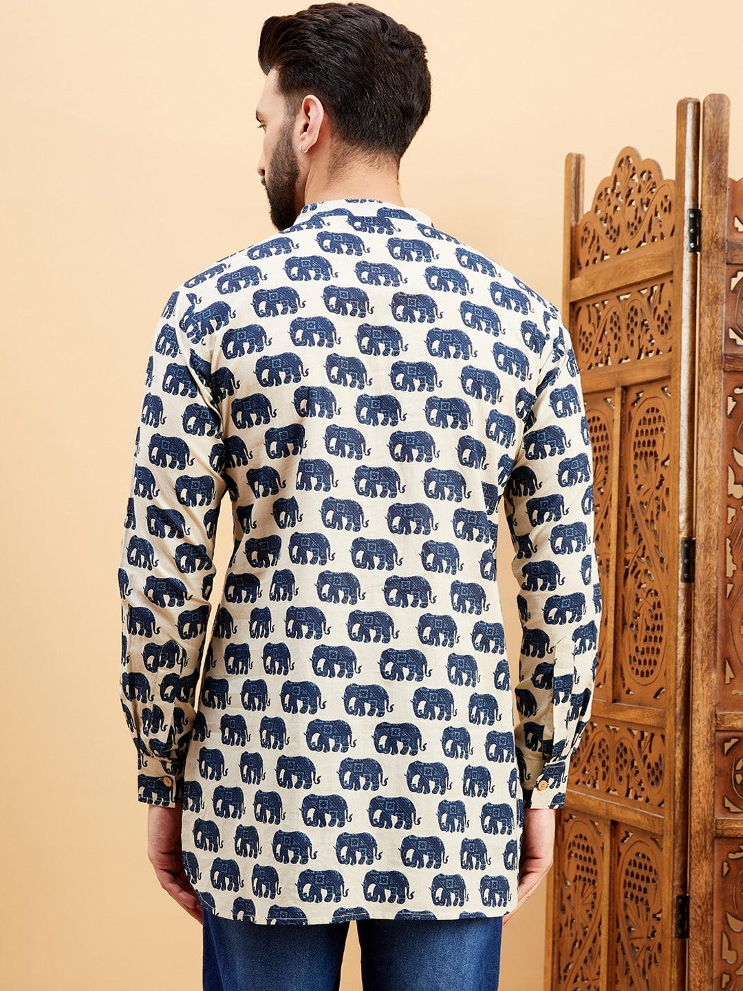 This off-white kurta features beautifully printed ethnic motifs and a sophisticated mandarin collar. The long, regular sleeves and A-line shape with layered style create a flattering fit, while the delicate thread work adds a touch of elegance. Crafted from machine-woven regular cotton, this kurta is comfortable and stylish for any occasion.