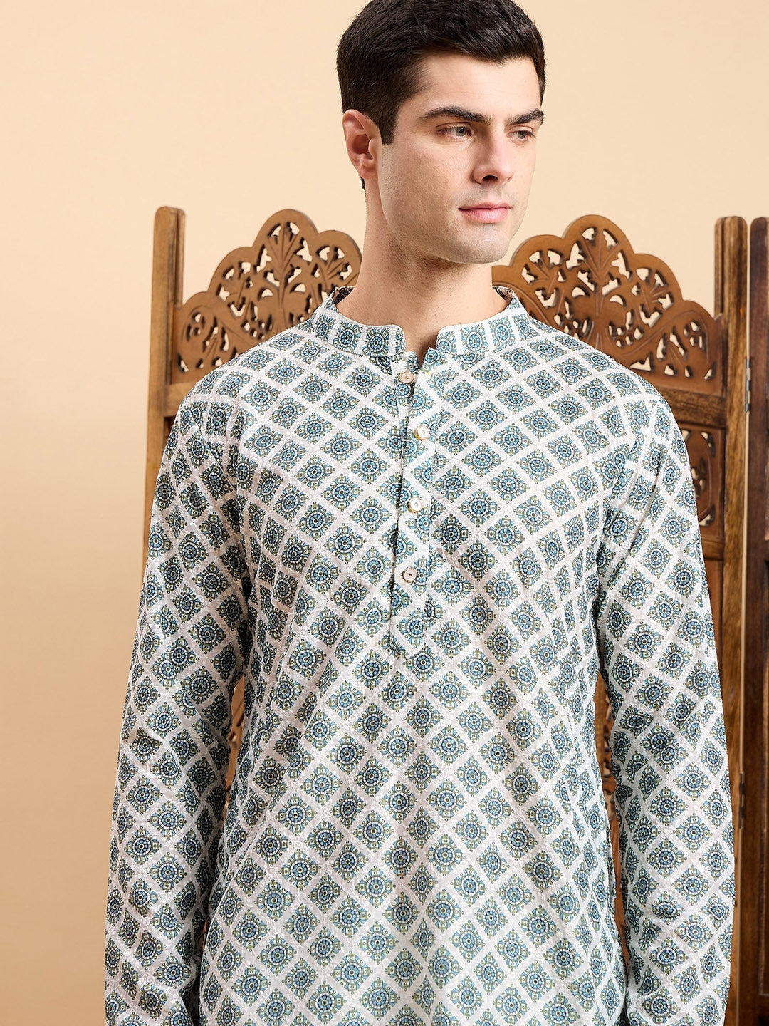 This blue and cream coloured kurta features ethnic motifs that are printed on a machine weave regular cotton fabric. It has a classic mandarin collar and long, regular sleeves. The straight shape with regular style gives a comfortable fit, while the straight hem and calf length add a touch of elegance. Perfect for any occasion.