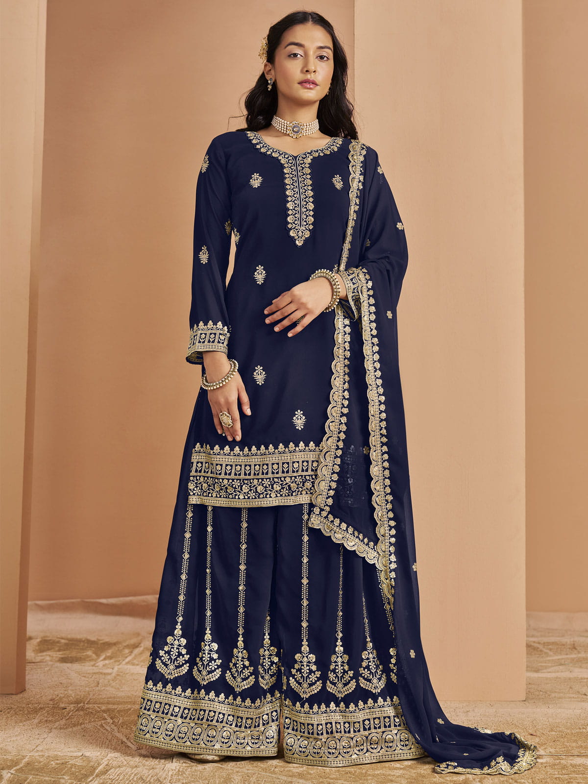 Elevate your style with the beautiful Blue Festive Style Embroidered Palazzo Suit. Delicate thread and sequin embroidery create a mesmerizing pattern on the lightweight faux georgette fabric, ensuring all-day comfort. The matching palazzo bottom and coordinating dupatta add modern sophistication to this perfect ensemble for weddings and festive celebrations.