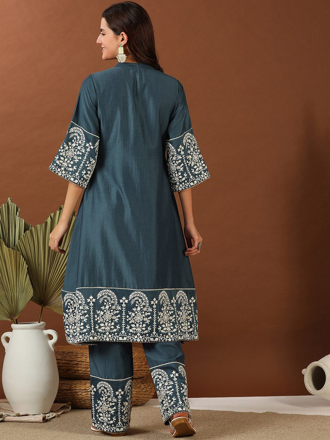 This Blue Floral Yoke Design Empire Thread Work Kurta With Palazzo features a beautiful floral yoke design and an empire style for a flattering Anarkali shape. The mandarin collar and three-quarter regular sleeves add a touch of elegance, while the silk blend machine weave fabric ensures comfort and durability. The palazzos, with their embroidered design and partially elasticated waistband, provide a comfortable and stylish fit. Perfect for any occasion.