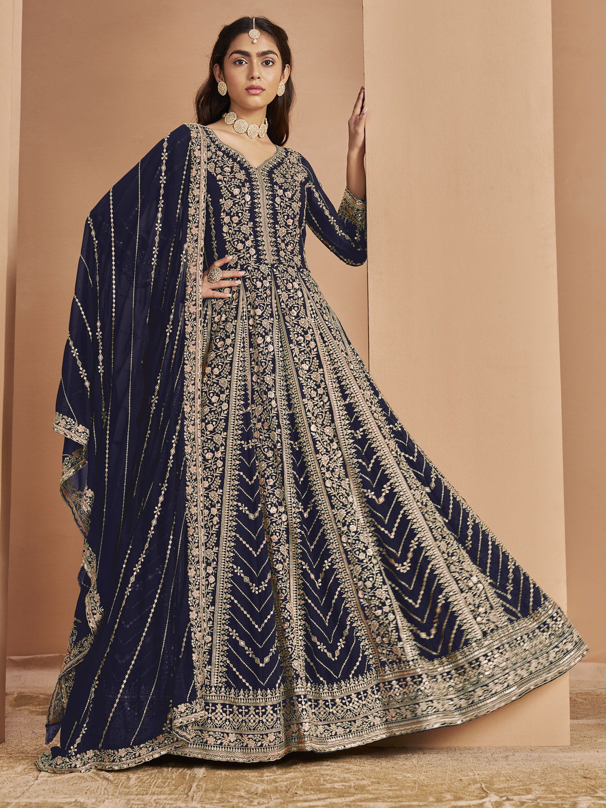 Elevate ethnic elegance with this expertly crafted, luxurious Blue Georgette Wedding Anarkali Suit by Inddus. Zari thread and sequin embroidery adorn the flowing Anarkali silhouette, highlighting the premium faux georgette fabric. Complete with a coordinated dupatta and tailored santoon bottom, this suit delivers sophisticated style for special occasions.