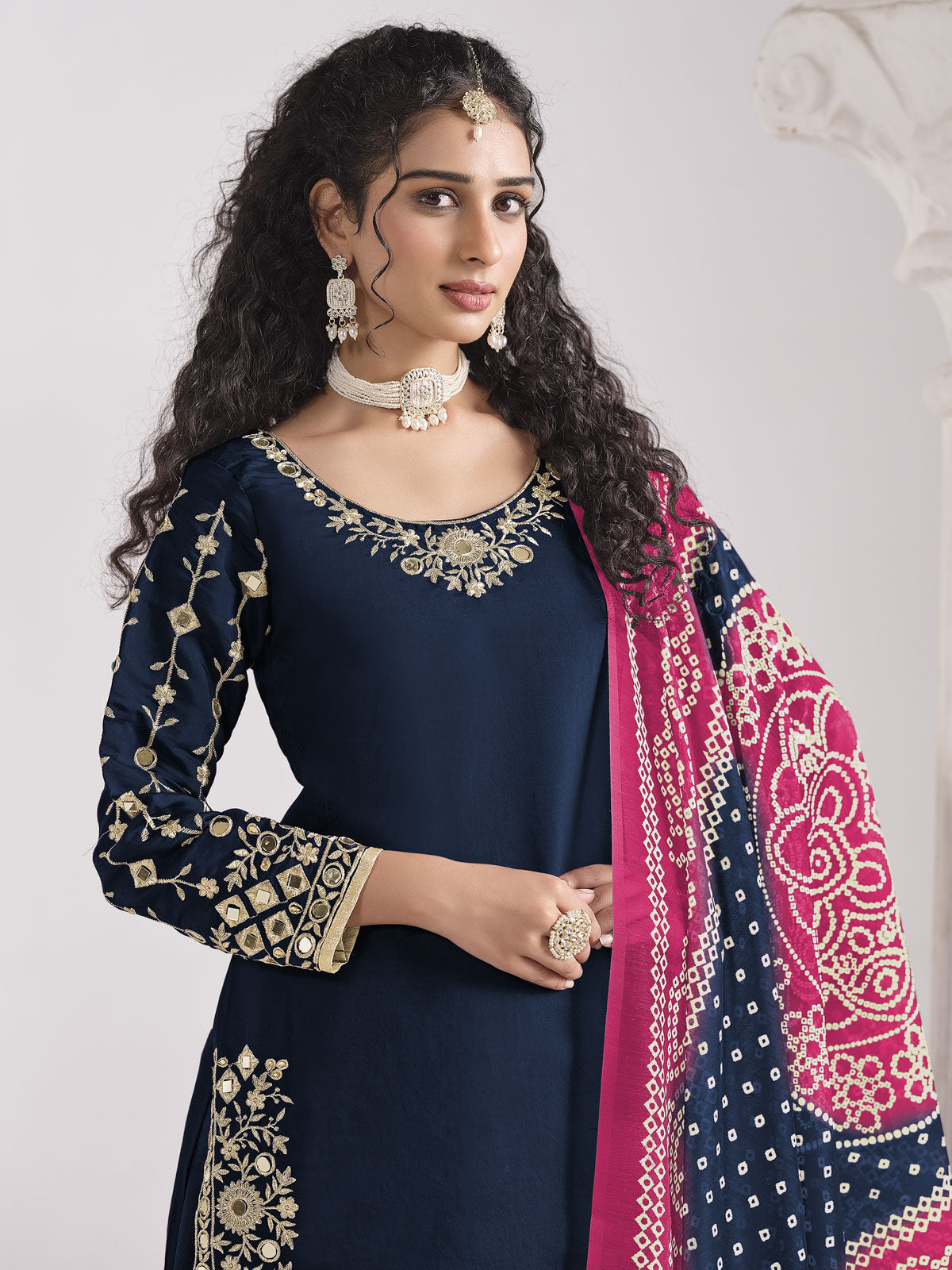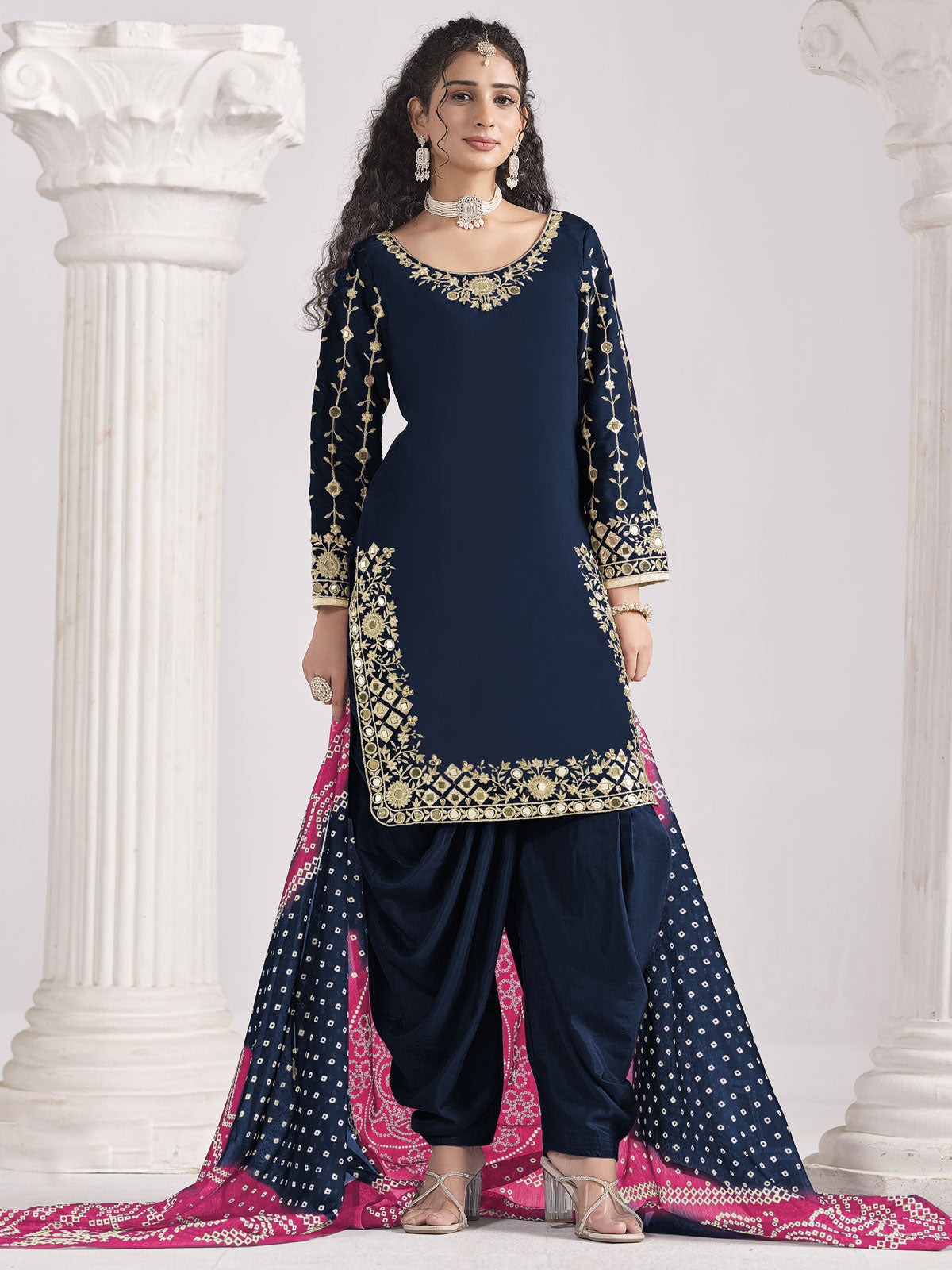Elevate your festive wardrobe with this stunning blue dhoti suit, meticulously crafted in luxurious art silk. The ensemble showcases intricate embroidered detailing complemented by shimmering mirror work and zari accents that radiate celebration and sophistication. The thoughtfully designed round neckline—medium depth at front, higher at back—creates a refined silhouette that honors traditional aesthetics while embracing modern sensibilities. Three-quarter sleeves frame the embellishments without overwhelming the design, while the thigh-length cut delivers contemporary flair. The coordinating art silk dupatta completes this versatile piece, perfect for weddings, festivals, and special occasions where refined elegance matters.