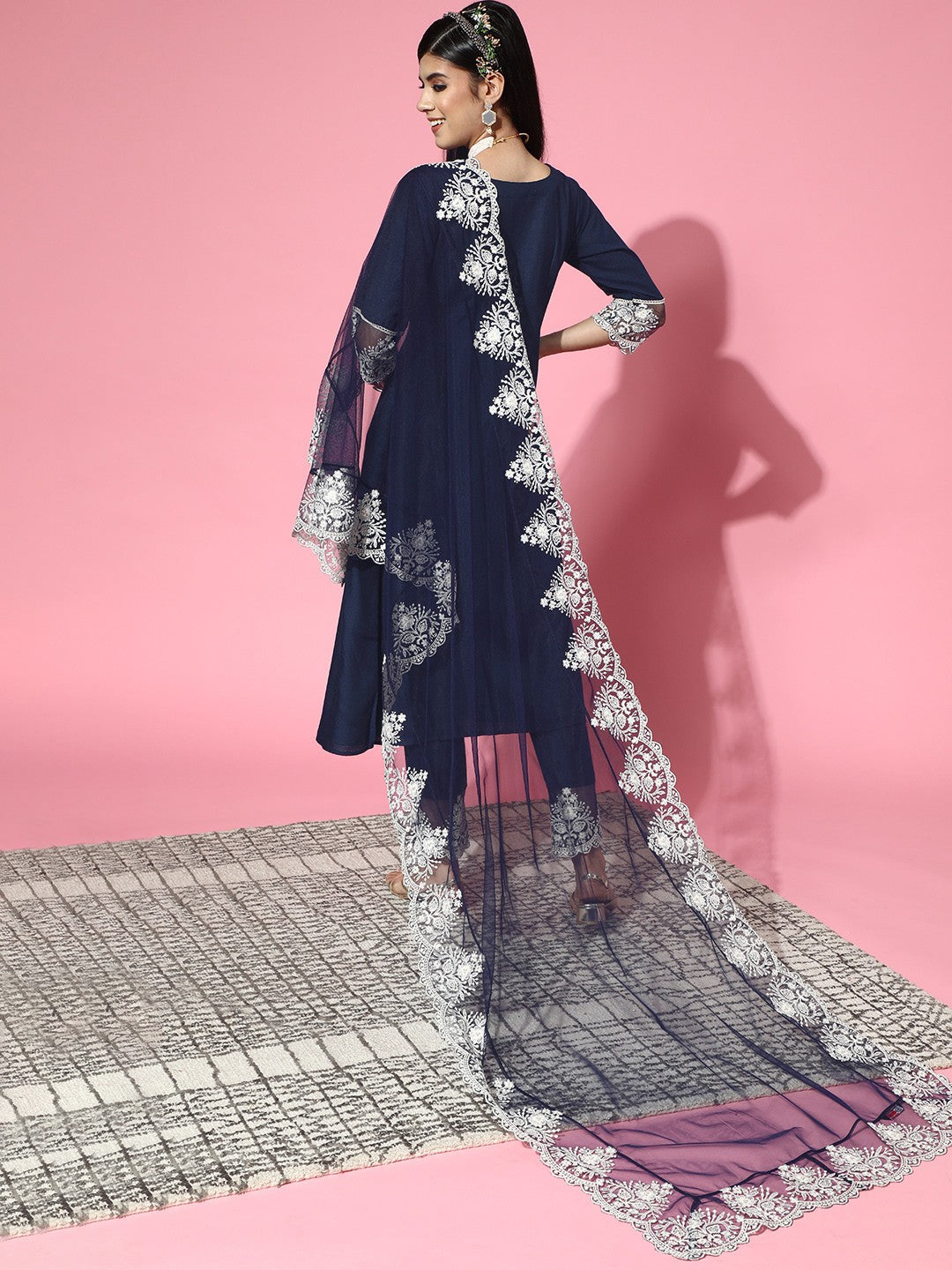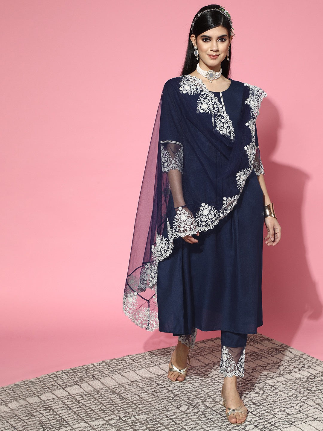 Impress with timeless elegance in this Blue Solid Cotton Blend Scalloped Edge Kurta Set. The calf length kurta boasts an alluring round neck and attractive three-quarter regular sleeves, giving you elevated appeal. The solid trousers feature a partially elasticated waist, and the net dupatta adds a touch of sophistication with a taping border. Made with cotton blend, all pieces can be easily dry cleaned.