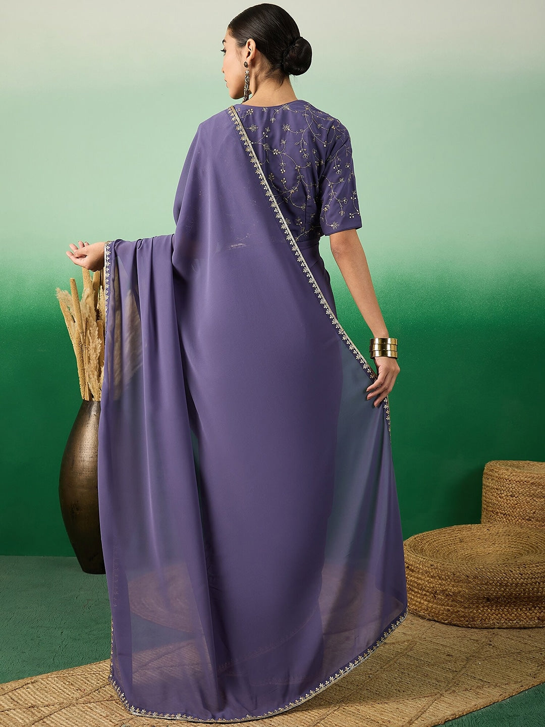 This elegant Blue Solid Zari Poly Georgette Saree features intricate Ari and Sequinned Embroidery with a delicate border. The embroidered detail adds a touch of sophistication. Comes with an unstitched blouse piece for customization. Elevate your wardrobe with this beautiful saree.