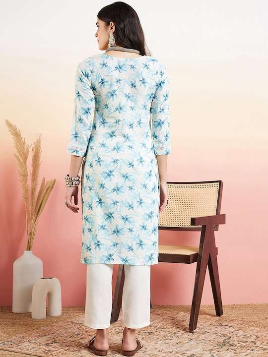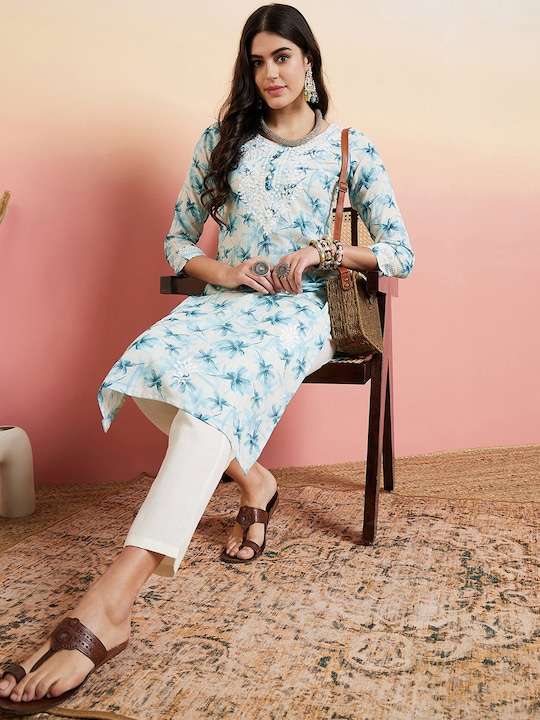 This Blue & White Floral Embroidered Straight Kurta With Trouser is the perfect addition to your wardrobe. The floral embroidery and chikankari detail add a touch of elegance to the kurta, while the cotton blend fabric ensures comfort. The straight shape and regular style are flattering, and the partially elasticated waistband on the trousers allows for a comfortable fit.