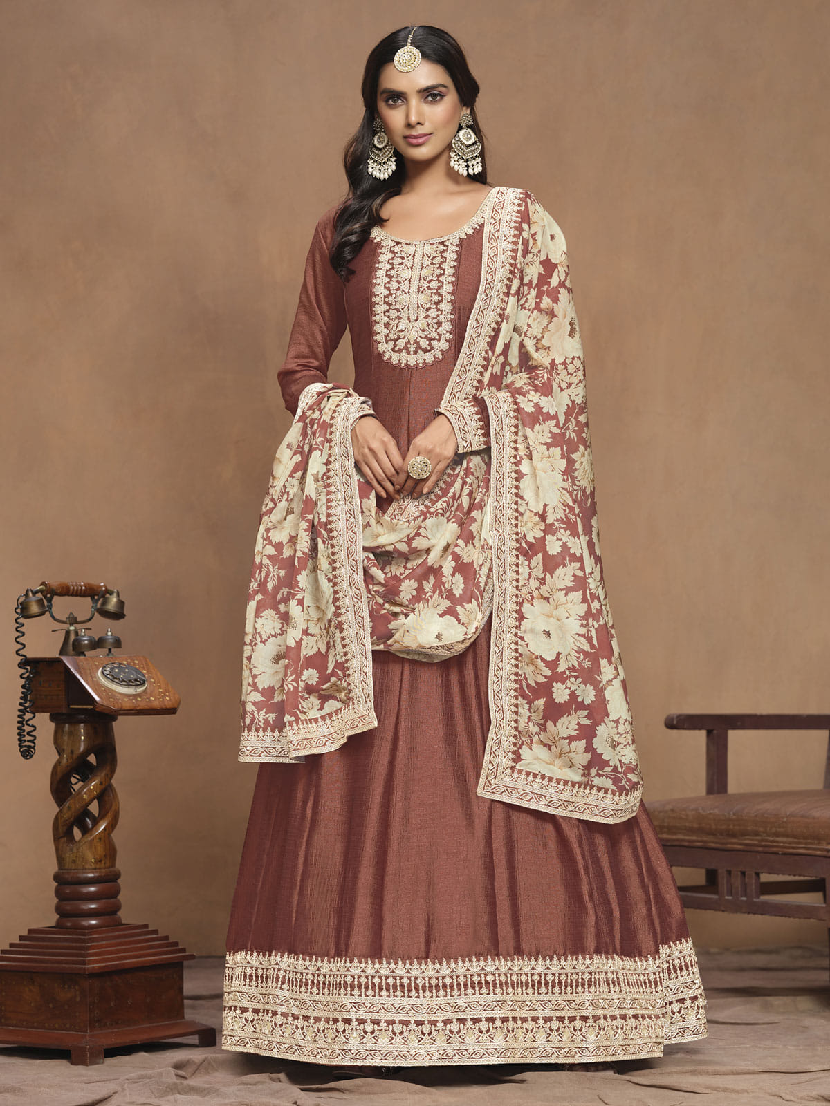 Elevate your festive look with our brown art silk anarkali suit, featuring intricate thread and zari embroidery with sequin embellishments. Paired with a shantoon pant and printed organza dupatta. Unstitched kameez size is 44 inches. Accessories shown are for styling purpose only. Slight color variation may occur due to photography.