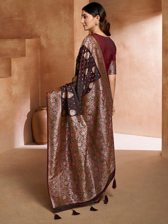 This brown pure silk saree features a stunning ethnic motif woven design with a gold-toned border and intricate zari details. Perfect for any festive occasion, this saree comes with an unstitched blouse piece for a customizable fit. Look elegant and stylish in this authentic and high-quality saree design.
