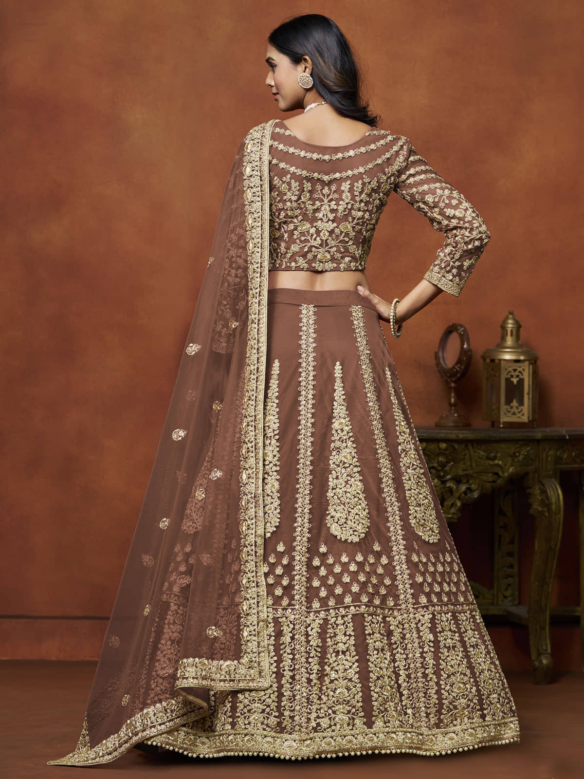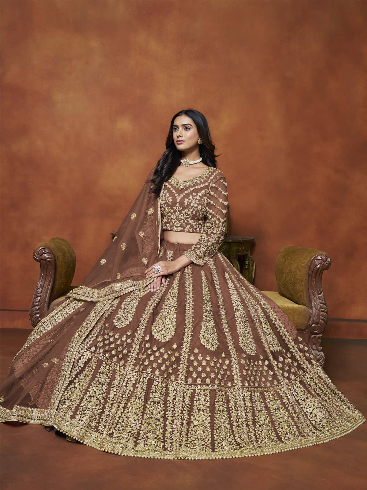 Elevate your festive wardrobe with this exquisite brown net lehenga choli, featuring intricate zari and sequin embroidery that adds a refined shimmer. Designed for elegance and versatility, it includes a matching choli and dupatta, making it perfect for celebrations and special occasions. The delicate craftsmanship ensures you stand out with subtle sophistication.