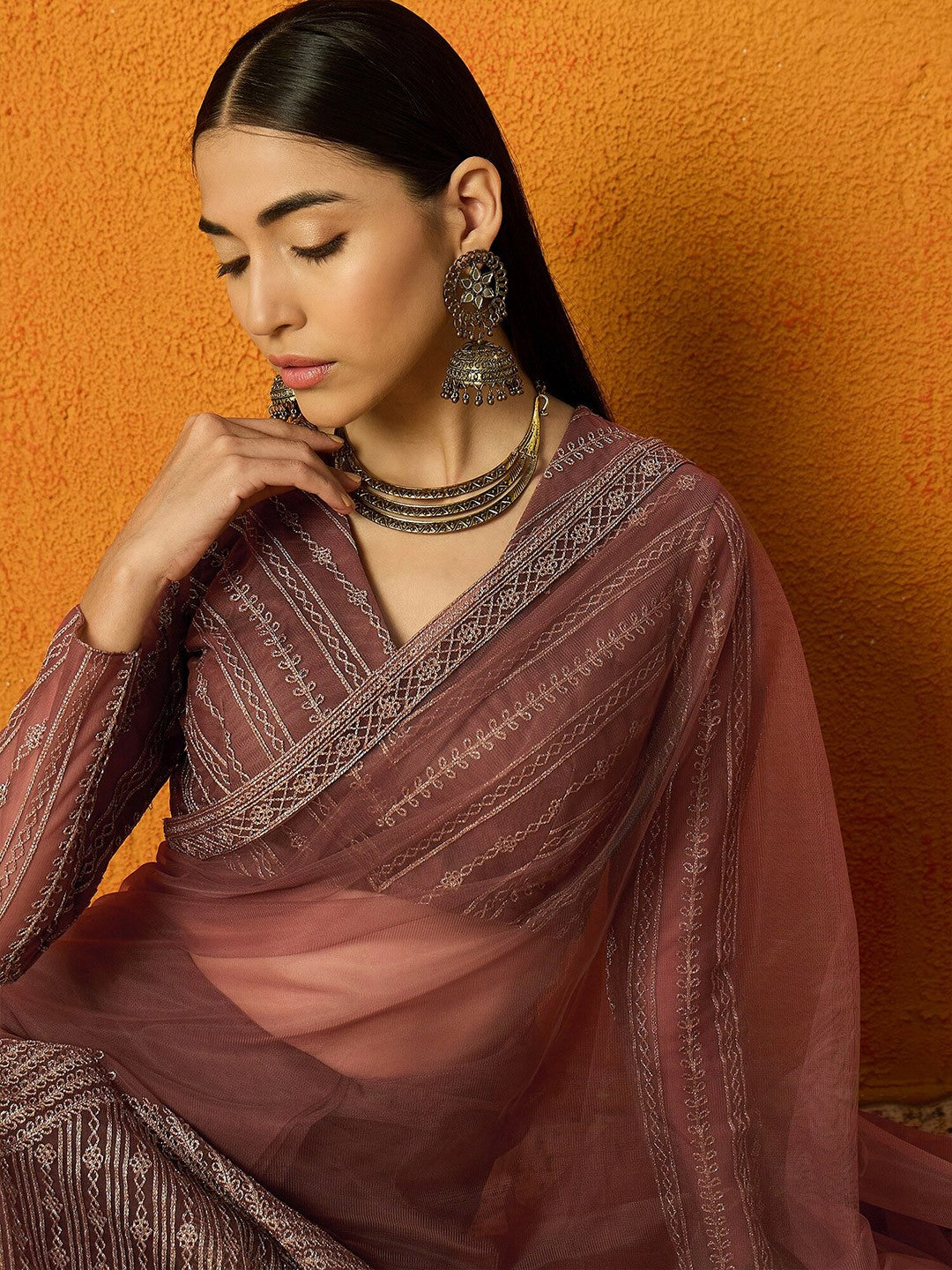 The Brown Floral Net Embroidered Saree features a solid brown color with gold-toned accents, giving it an elegant look. The embroidered border adds a touch of intricate detail to the saree, making it perfect for special occasions. The saree also comes with an unstitched blouse piece, giving you the freedom to customize your look.