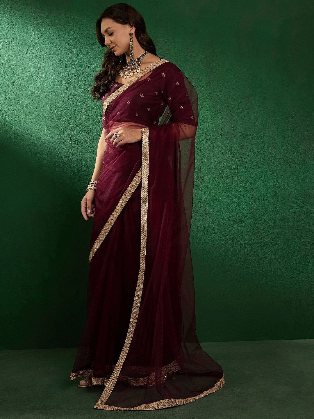 This burgundy saree features an embroidered border and detailed embellishments, adding elegance to the solid color. Includes an unstitched blouse piece for customizable wear. Step out in style with this versatile and sophisticated piece.