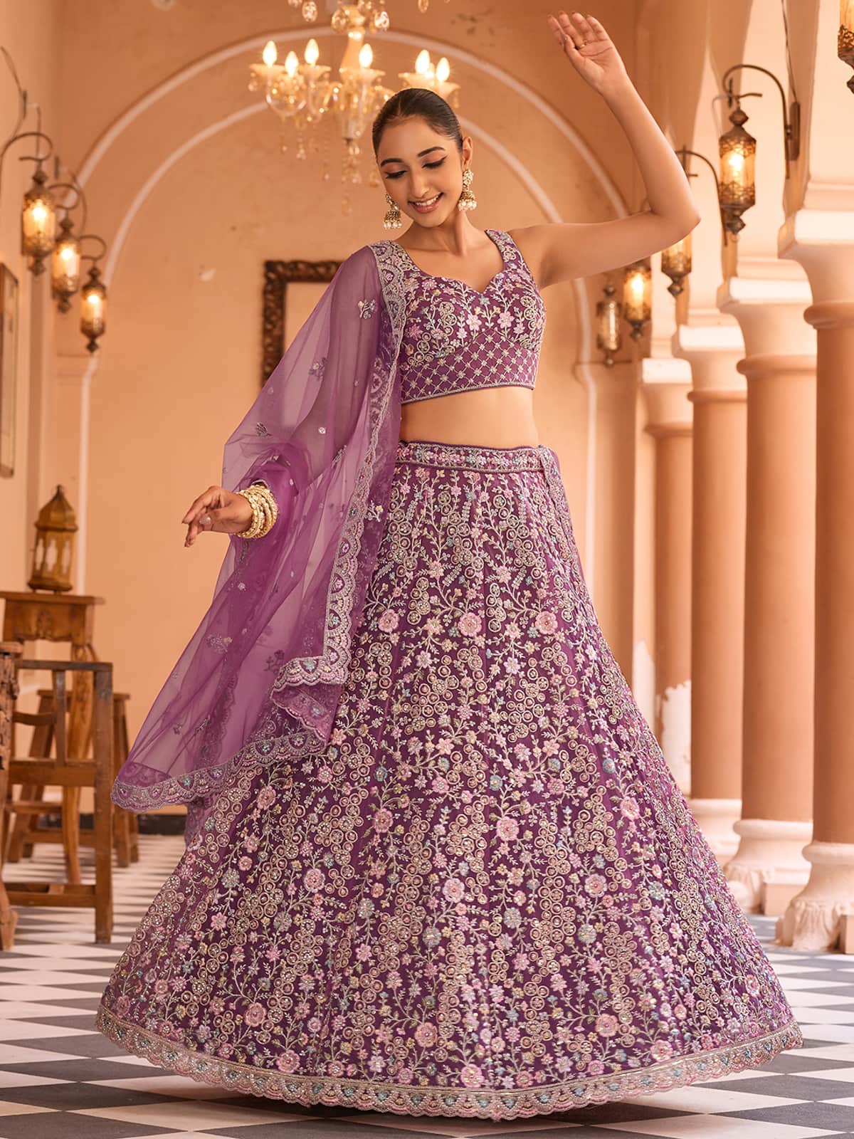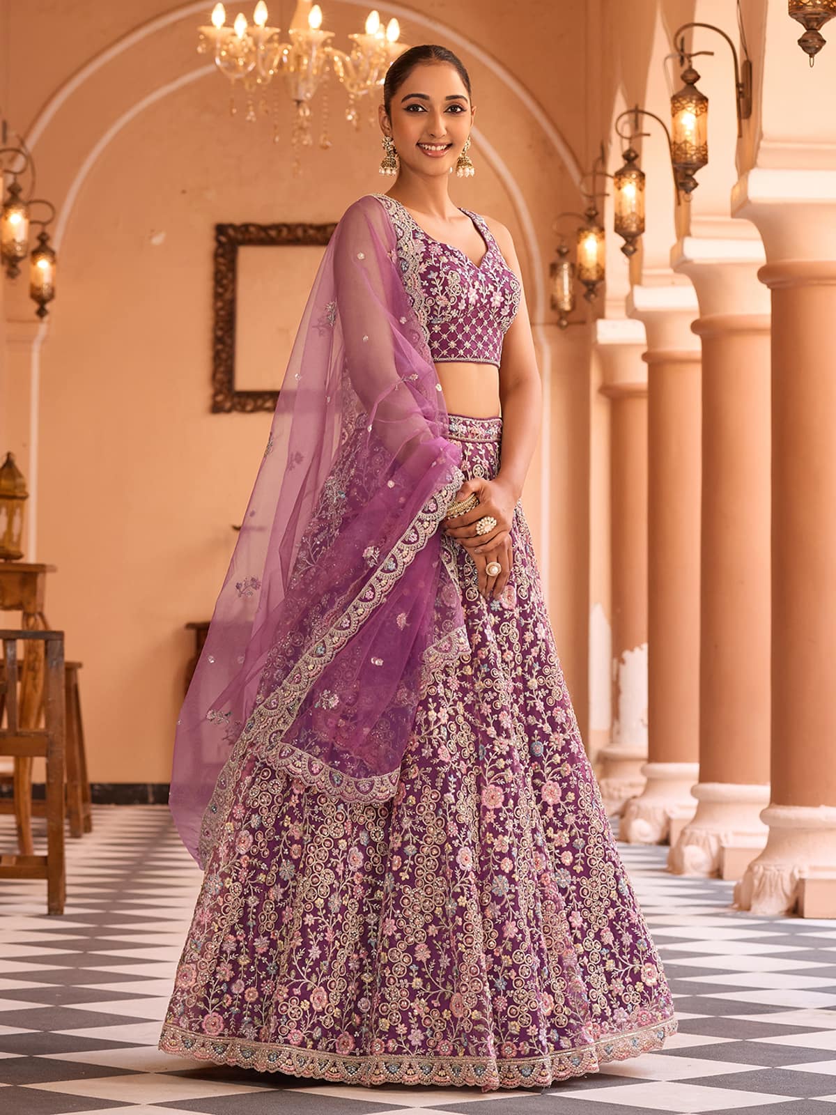 Elevate your ethnic wardrobe with this exquisite burgundy lehenga set, crafted from premium net fabric. The semi-stitched lehenga features intricate sequin and stone embellishments complemented by detailed thread embroidery and cutwork borders. A generous 3.5-meter flair with attached inner ensures graceful movement, while the structured construction includes shantoon lining and layered buckram support. The matching net dupatta showcases heavy coding and embroidered cutwork detailing for added sophistication. The unstitched blouse in burgundy net presents a flattering V-neckline adorned with elaborate sequin work, coding, and thread embroidery, complete with attached shantoon lining for comfort and structure.