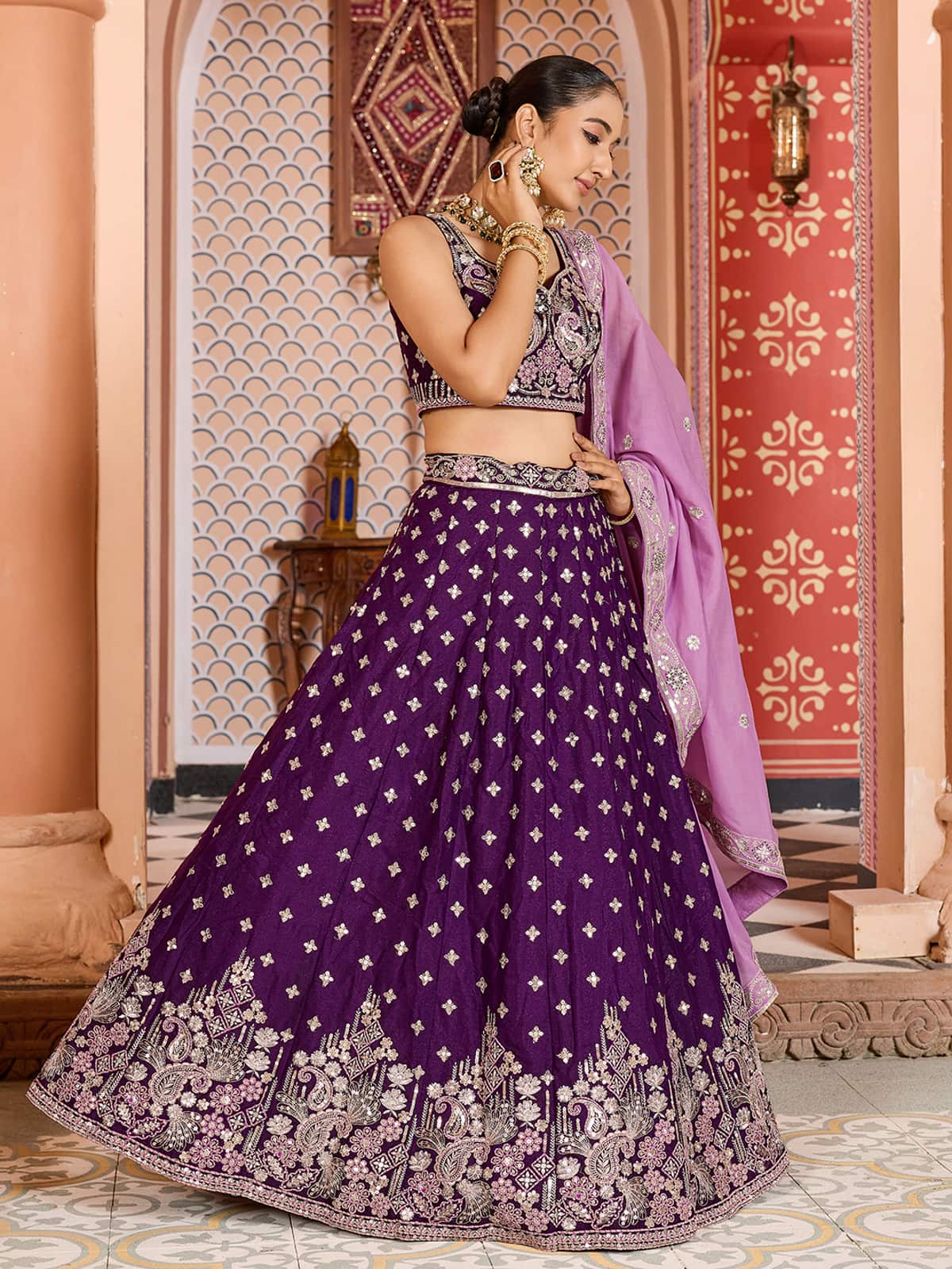 This exquisite lehenga ensemble showcases burgundy tissue silk crafted with meticulous artistry. The semi-stitched lehenga features intricate sequin and coding embellishments complemented by traditional jari work and a refined thread border. A generous 3.5-meter flair with attached inner ensures graceful movement, supported by professional stitching construction including shantoon lining and layered buckram support. The matching sweetheart-neckline blouse displays lavish sequin detailing, coding, and thread embroidery on burgundy tissue silk with integrated shantoon backing. The coordinating lavender tissue silk dupatta presents an elegant contrast with elaborate coding, embroidery, and decorative tapping border. This semi-stitched ensemble combines traditional craftsmanship with contemporary design, offering versatility for customized fitting.