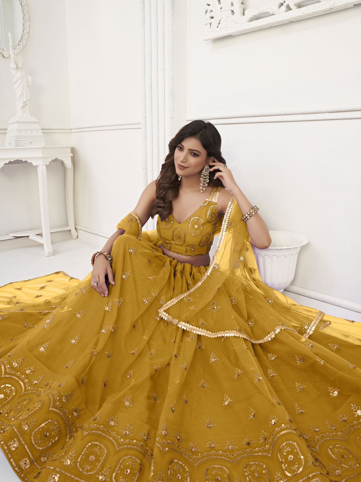 Experience sheer elegance and charm with our Charming Yellow Sequins Net Haldi Wear Lehenga Choli. Perfect for weddings and festive occasions, this set features delicate embroidery, intricate thread work, and elegant sequin embellishments. Customize the semi-stitched lehenga up to 42 inches for a perfect fit. Complete the look with the matching choli and dupatta, adorned with fancy lace work. Heads are sure to turn at any event with this ethereal ensemble.