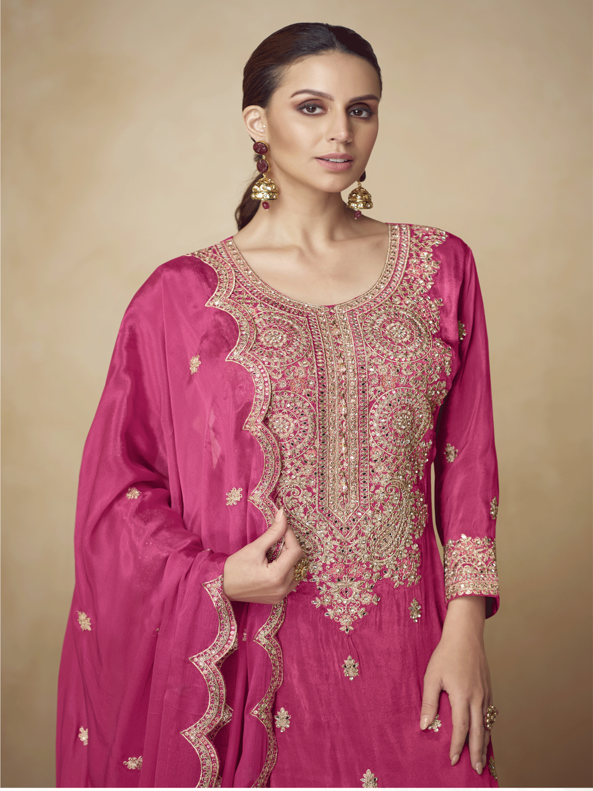 Elevate your festive wardrobe with this exquisite Pink palazzo suit crafted from premium real chinnon silk. Each piece showcases masterful hand embroidery, featuring intricate zari work, refined threadwork, and shimmering sequins that catch light beautifully. The sophisticated ensemble comprises an elegantly embroidered kurta, flowing palazzo bottoms, and a coordinating dupatta, delivering refined elegance for celebrations and special occasions. A testament to traditional craftsmanship and contemporary style.