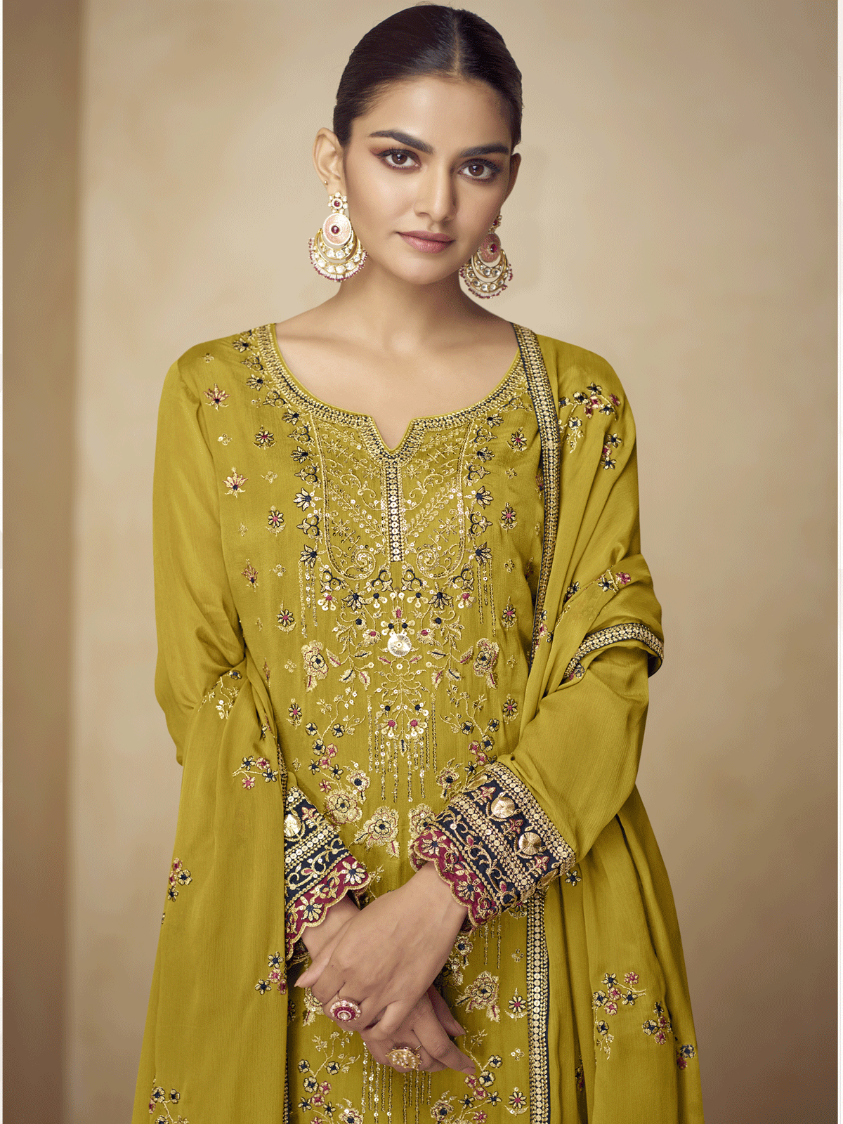 Elevate your festive wardrobe with this exquisite yellow palazzo suit crafted from premium real chinnon silk. Each piece showcases masterful hand embroidery, featuring intricate zari work, refined threadwork, and shimmering sequins that catch light beautifully. The vibrant yellow fabric provides a striking canvas for the detailed embellishments, creating an ensemble of timeless elegance. The coordinated set includes palazzo-style bottoms and a matching dupatta, offering a complete, sophisticated look for celebrations and special occasions. Perfect for those who appreciate authentic craftsmanship and refined Indian fashion.